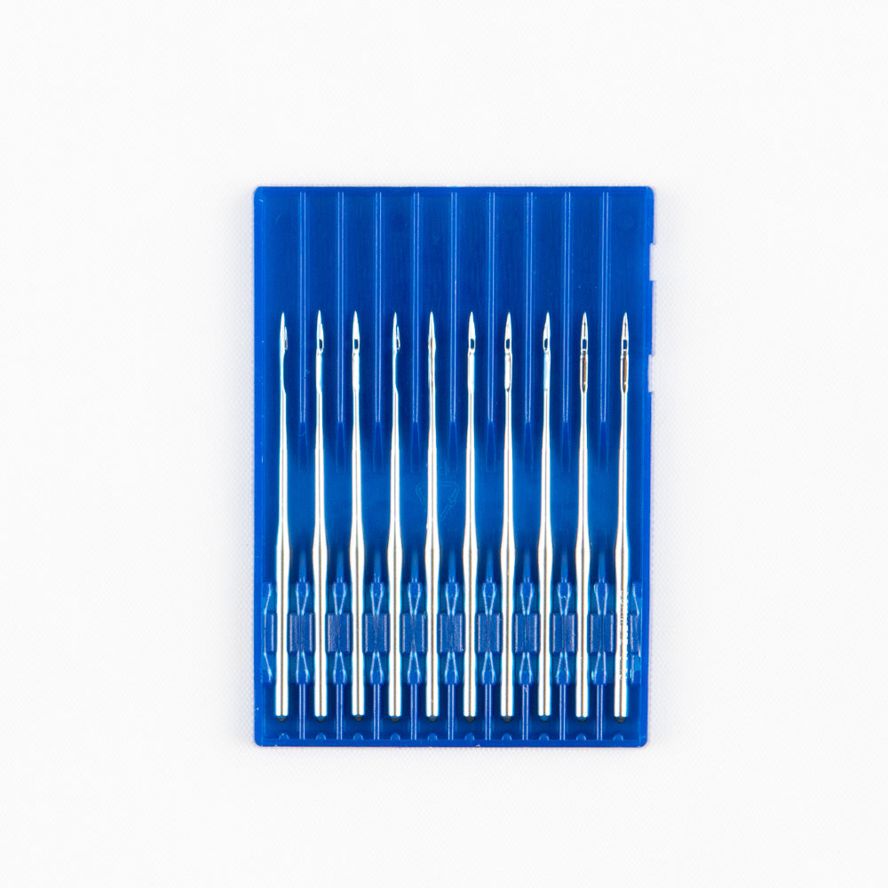 As agulhas para máquinas de costura universais, com ponta ligeiramente arredondada e salto redondo, costuram perfeitamente muitos tipos de tecidos, geralmente para uso em máquinas industriais de agulha única. Sistema: 287WH / 1738. Espessura da agulha a escolher. Preço por pacote de 10 unidades.