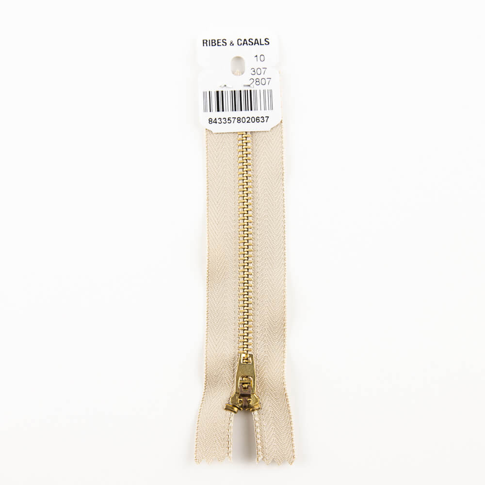 Zíper fechado de malha 3 com dentes de metal dourados em malha bege. Zíper de alta durabilidade, ideal para jeans, bolsas e outras aplicações que necessitem de um aporte extra de resistência. Disponível em vários tamanhos, preço por unidade.
