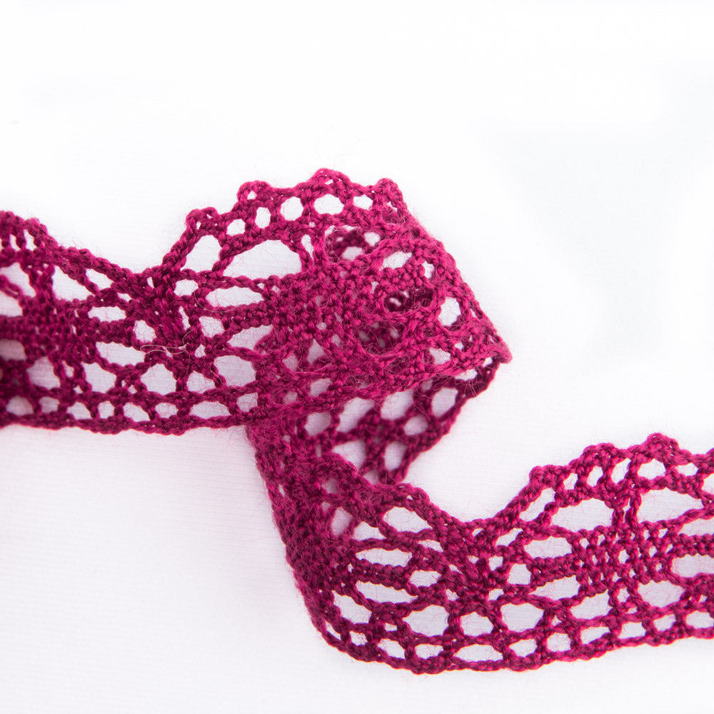 Tira de puntilla de poliéster en color granate. Tira de puntilla calada en forma de ondas de 2 cm de ancho toda del mismo color. Compra a partir de 1 metro, compra los metros de puntilla que necesites. Precio en oferta hasta agotar existencias.