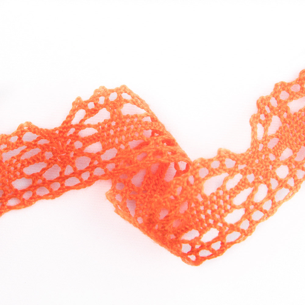 Tira de puntilla de poliéster en color naranja. Tira de puntilla calada en forma de ondas de 2 cm de ancho toda del mismo color. Compra a partir de 1 metro, compra los metros de puntilla que necesites. Precio en oferta hasta agotar existencias.