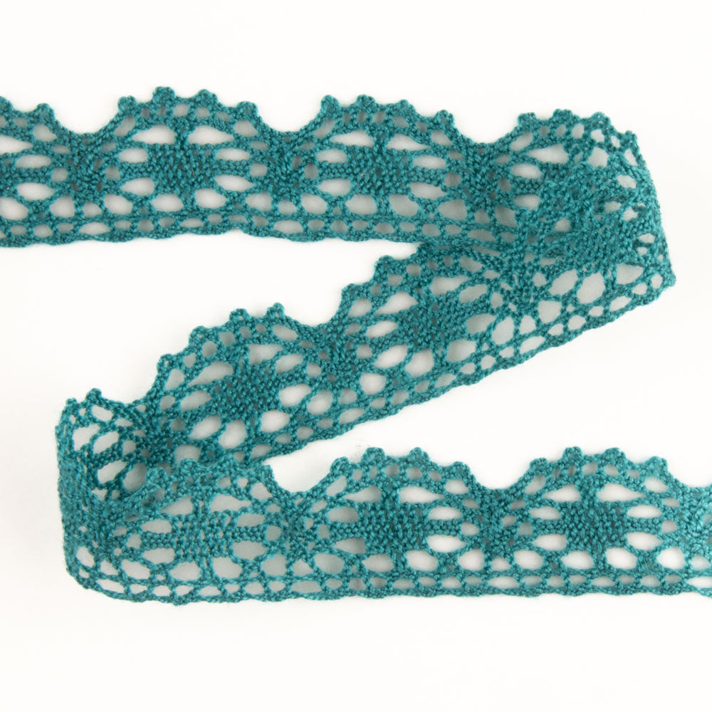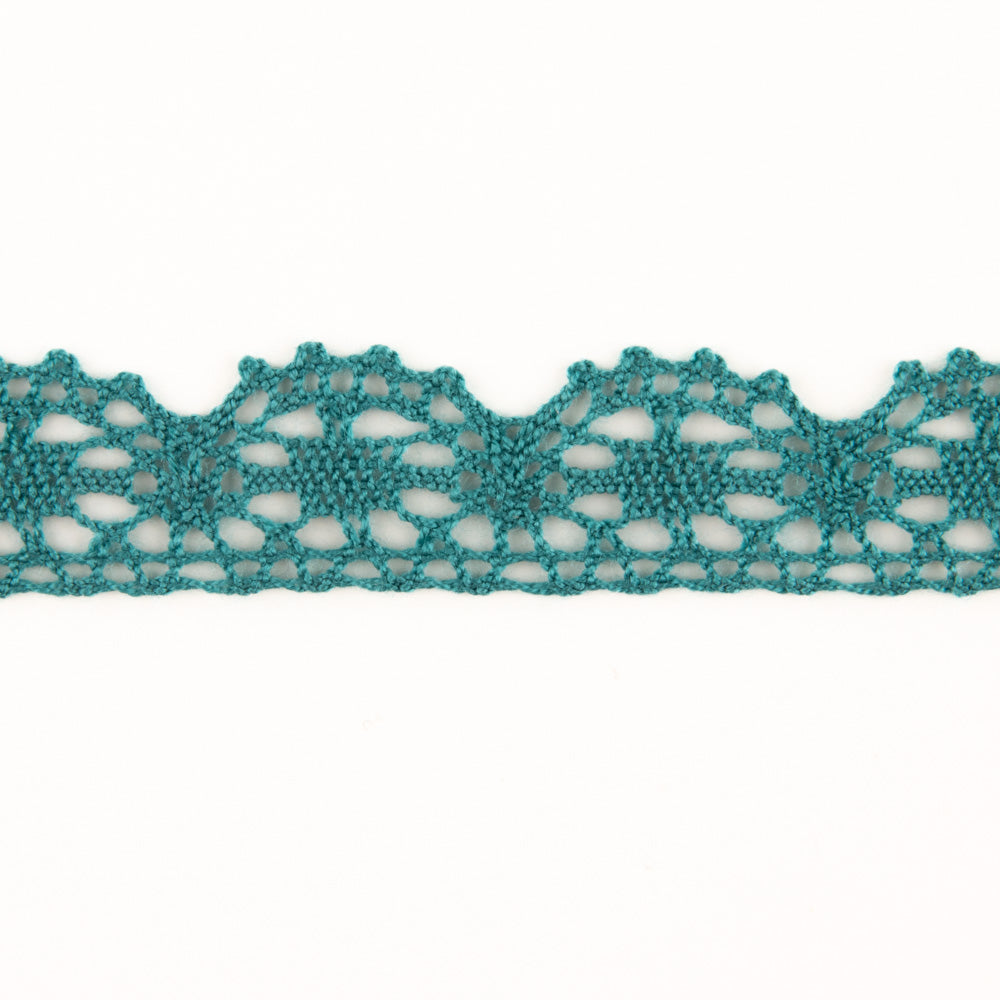 Tira de puntilla de poliéster en color verde azulado. Tira de puntilla calada en forma de ondas de 2 cm de ancho toda del mismo color. Compra a partir de 1 metro, compra los metros de puntilla que necesites. Precio en oferta hasta agotar existencias.