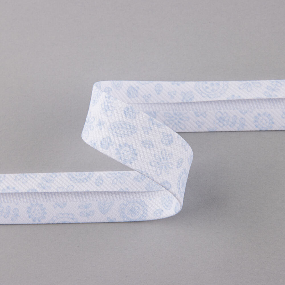 Fita de viés com impressão de folhas em azul. Largura de fita de 18 mm. Preço por metro.