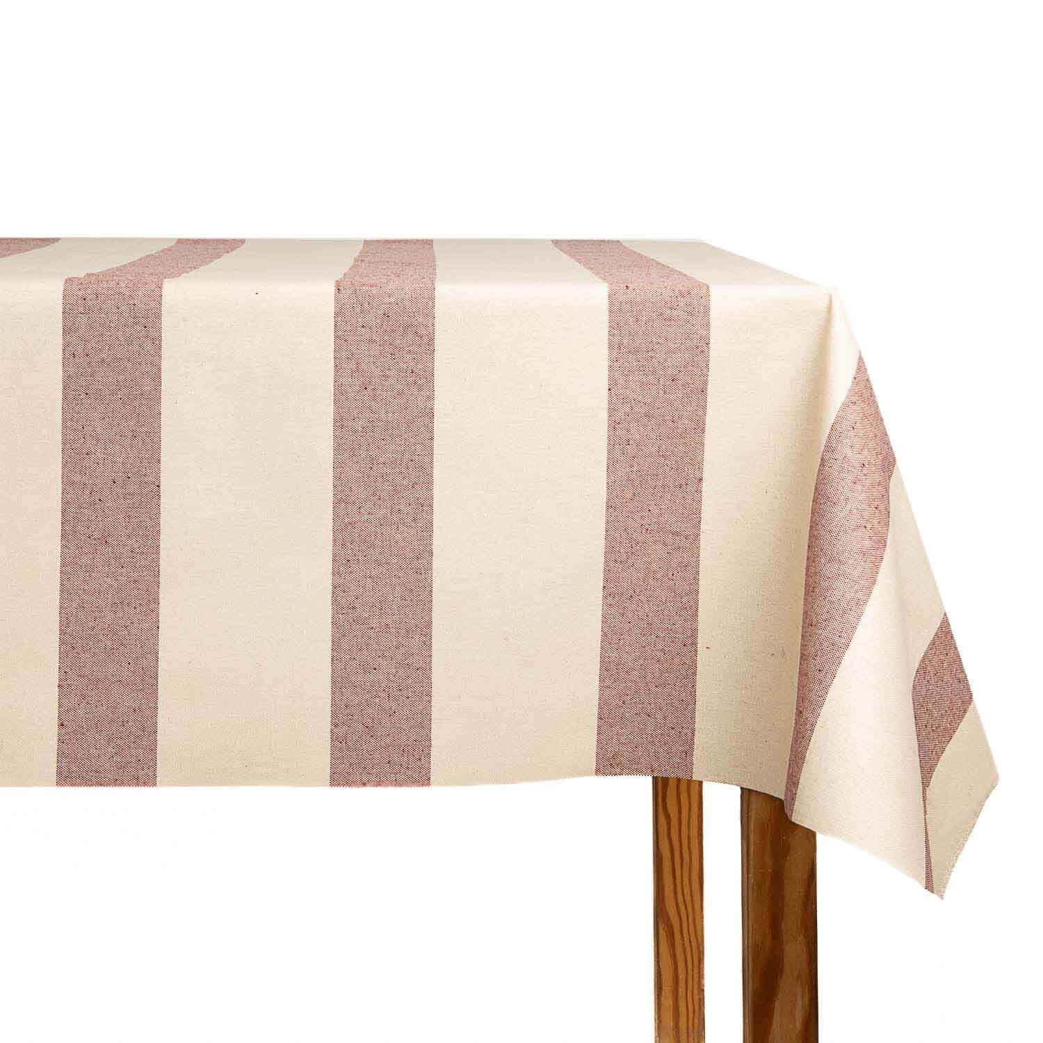 Composição: 100% algodão teflonado | Acabamento: Antimanchas / repelente a líquidos | Design: Faixas vermelhas de 5,50 cm sobre fundo cru | Estilo: Saco francês / grão de saco | Utilização: Toalhas de mesa, cozinha e decoração