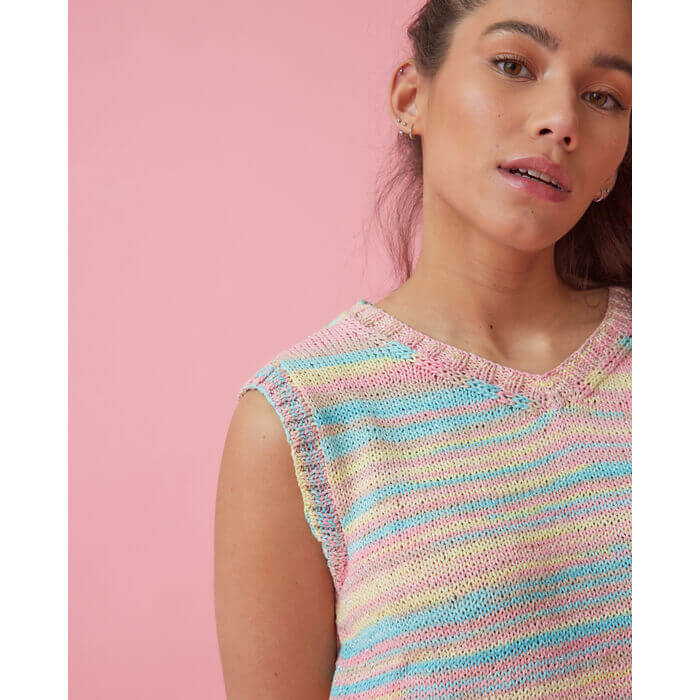 Novelo da coleção Pingouin Festival, fio de algodão multicolorido com brilho leve. Fio ideal para tricotar uma variedade de roupas para a primavera, vestidos, tops, acessórios. Disponível em diferentes tonalidades. Novelo de 50 gramas e +/- 135 metros. Compre 9 novelos para tricotar uma camisola tamanho 42, 6 novelos para tricotar uma camisola tamanho 6.