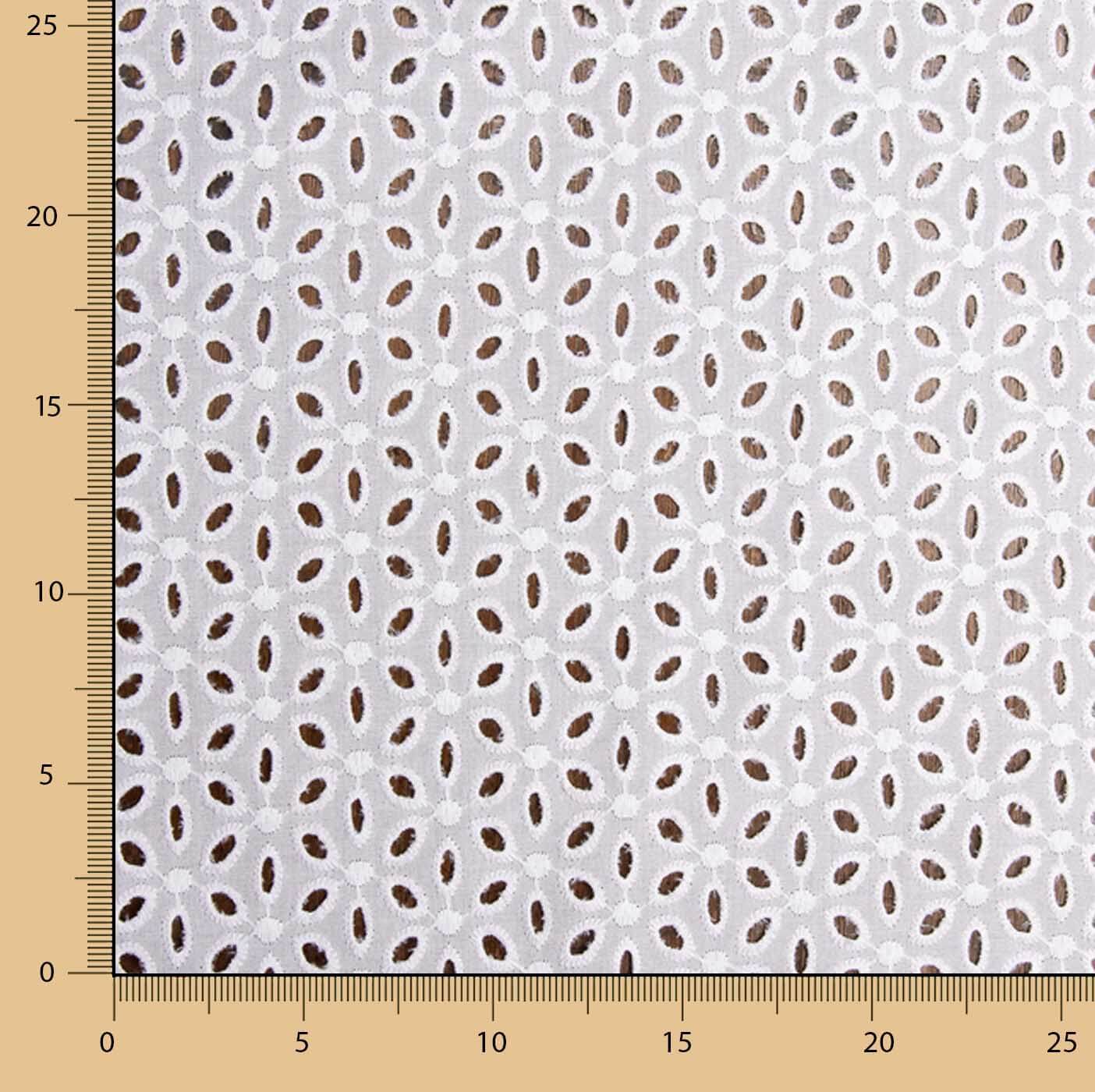 Tecido com bordado suíço perfurado flor pétala branco natural. Tecido 100% algodão tipo voile de cor branca, suave, ligeiramente sustentado. Bordado calado flamenco em algodão fino, com toque natural e relevo criado pelo próprio bordado. Tecido bordado de grande qualidade, que intercala um gracioso perfurado muito subtil, proporcionando um jogo de transparências fresco e juvenil. Tecido ideal para a confeção de trajes de sevillana, aplicações e folhos de flamenca. Pode utilizar este tipo de bordado suíço de voile nas suas criações mais frescas, conferindo-lhes um ar romântico e descontraído: vestidos ibicencos, blusas, tops, saias... bem como em acessórios e adornos.