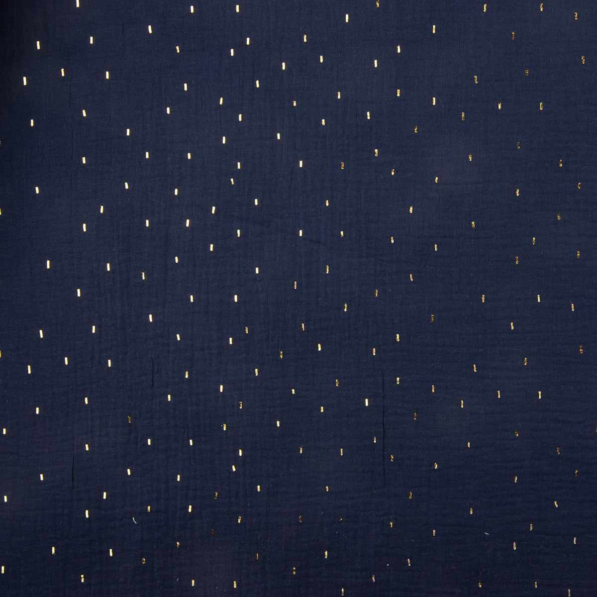 Fresca, leve e com um toque de brilho subtil, este tecido de gaze dupla em azul marinho com detalhes em lúrex dourado é perfeito para confecionar peças com um ar natural e elegante. Fabricado em 100% algodão e com uma largura de 140 cm, destaca-se pela sua textura esponjosa e suave ao toque, ideal para roupas vaporosas e confortáveis. As pequenas linhas descontínuas de 3 mm em lúrex dourado conferem-lhe um toque delicado de luminosidade, sem retirar naturalidade ao acabamento. Graças à sua estrutura de dupla camada, esta gaze tem corpo, maior opacidade e não necessita de forro para a maioria das suas utilizações. É muito apreciada na confeção de blusas, vestidos largos, roupa infantil, lenços, panos de bebé e decoração têxtil leve, como cortinas ou colchas de entre-estações. O seu aspeto natural amarrotado evita a necessidade de engomar e a sua composição 100% algodão garante transpirabilidade e conforto.