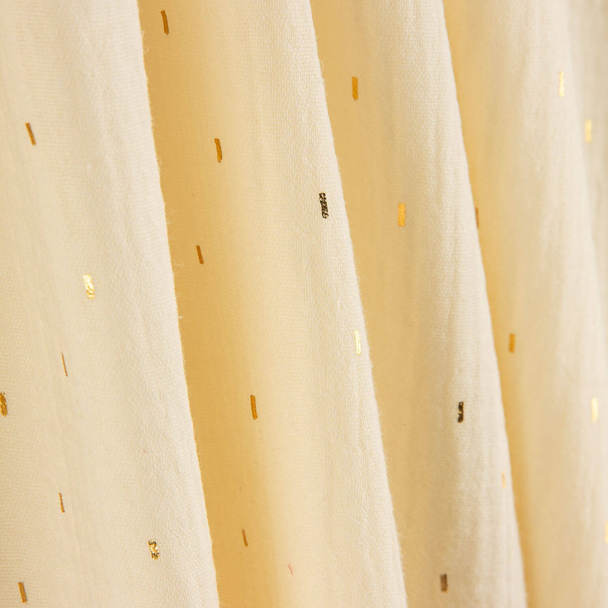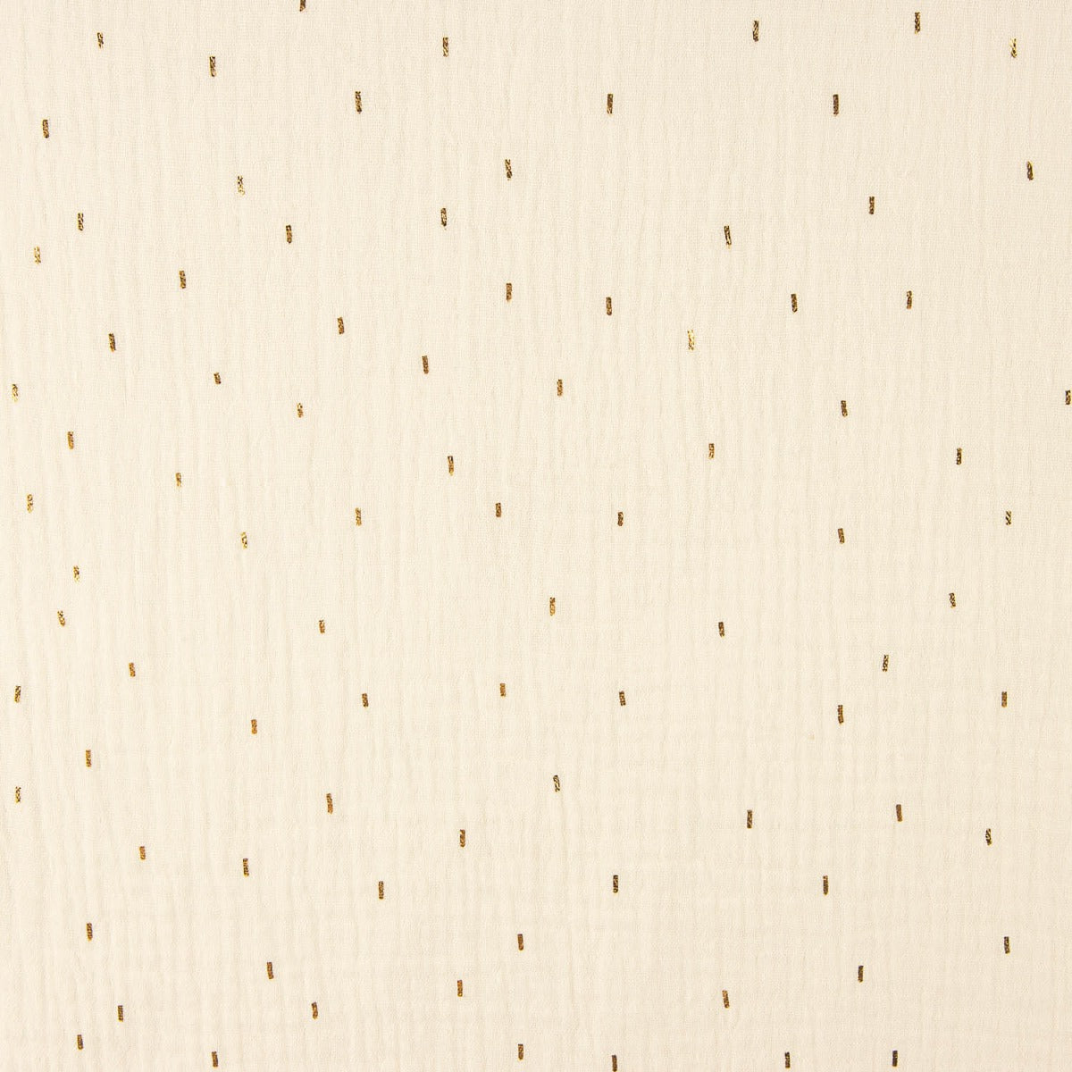 Natural, leve e com um toque de brilho discreto, este tecido de bambula dupla gaze em cor cru com lúrex dourado é ideal para confeções suaves, elegantes e intemporais. Feito em 100% algodão e com 140 cm de largura, oferece uma textura esponjosa e arejada, perfeita para peças confortáveis e respiráveis. O detalhe distintivo deste tecido está nas suas finas linhas douradas descontínuas (de cerca de 3 mm) em lúrex, que lhe conferem um brilho subtil sem perder a essência orgânica e delicada da bambula. É muito apreciado para blusas, vestidos vaporosos, roupa infantil, panos de bebé, lenços ou decoração leve, como cortinas ou colchas de entre-estações. Graças à sua estrutura de dupla camada, não necessita de forro e proporciona um caimento fluido, com o aspeto enrugado natural característico da bambula, o que a torna um tecido prático e muito fácil de manter.