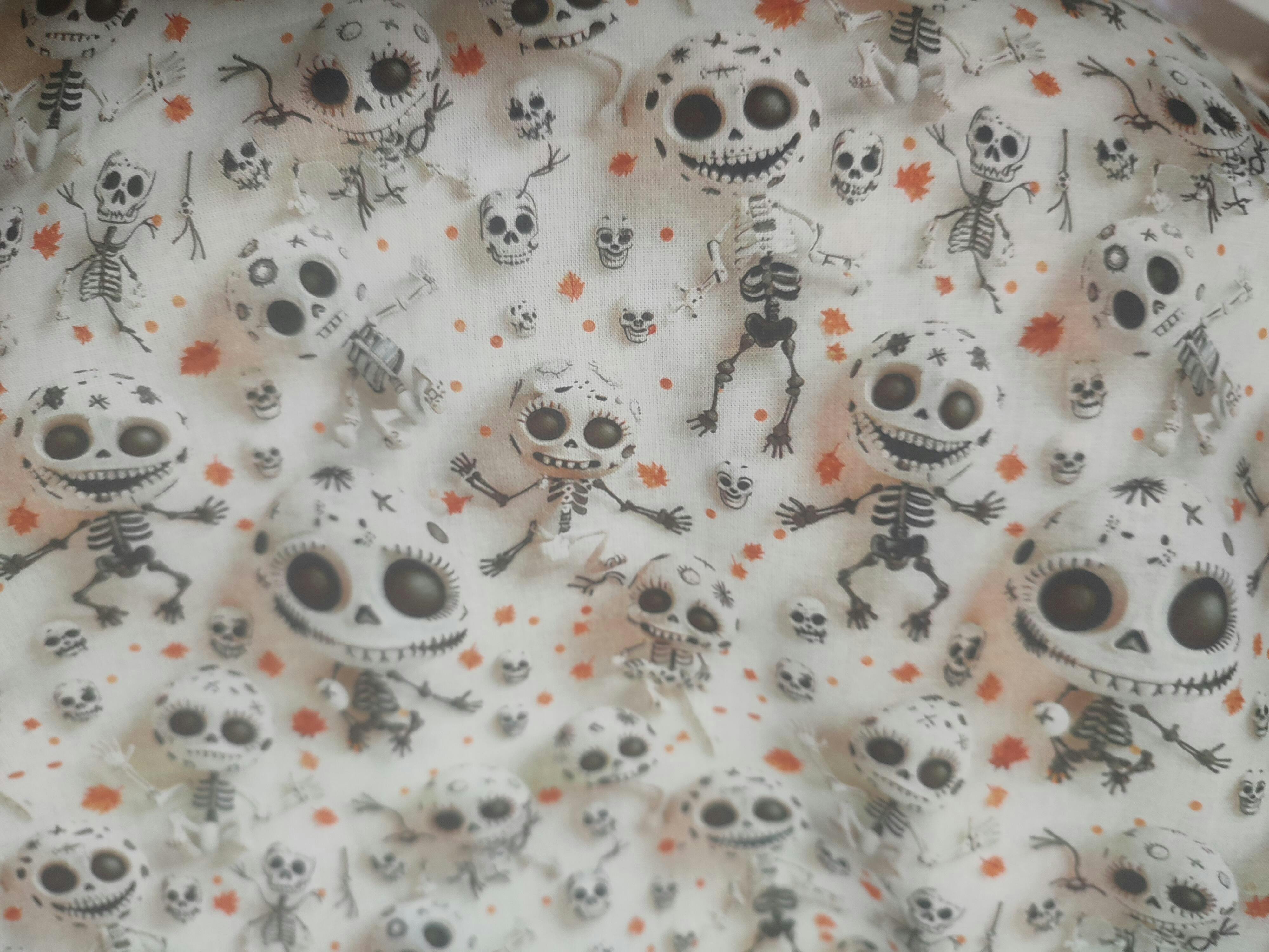 Tecido de popeline de algodão com estampado digital de desenhos “terroríficos” infantis de esqueletos, um estampado com leve sombreamento para um efeito 3D vivo em multicores. O popeline de algodão oferece uma textura suave, leve e durável, garantindo conforto e transpirabilidade. A impressão digital permite designs vibrantes e detalhados com precisão inigualável, trazendo um toque único e personalizado a cada peça. Esta combinação é ideal para uma ampla gama de projetos de confecção, como camisas, vestidos, blusas e acessórios, sendo muito utilizado também para trabalhos de patchwork.