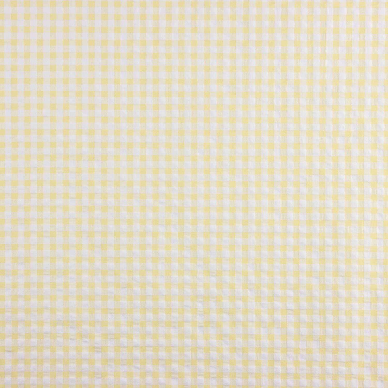 Tecido de algodão e poliéster estilo seersucker ou bambula, com padrão xadrez em tons de amarelo e branco.