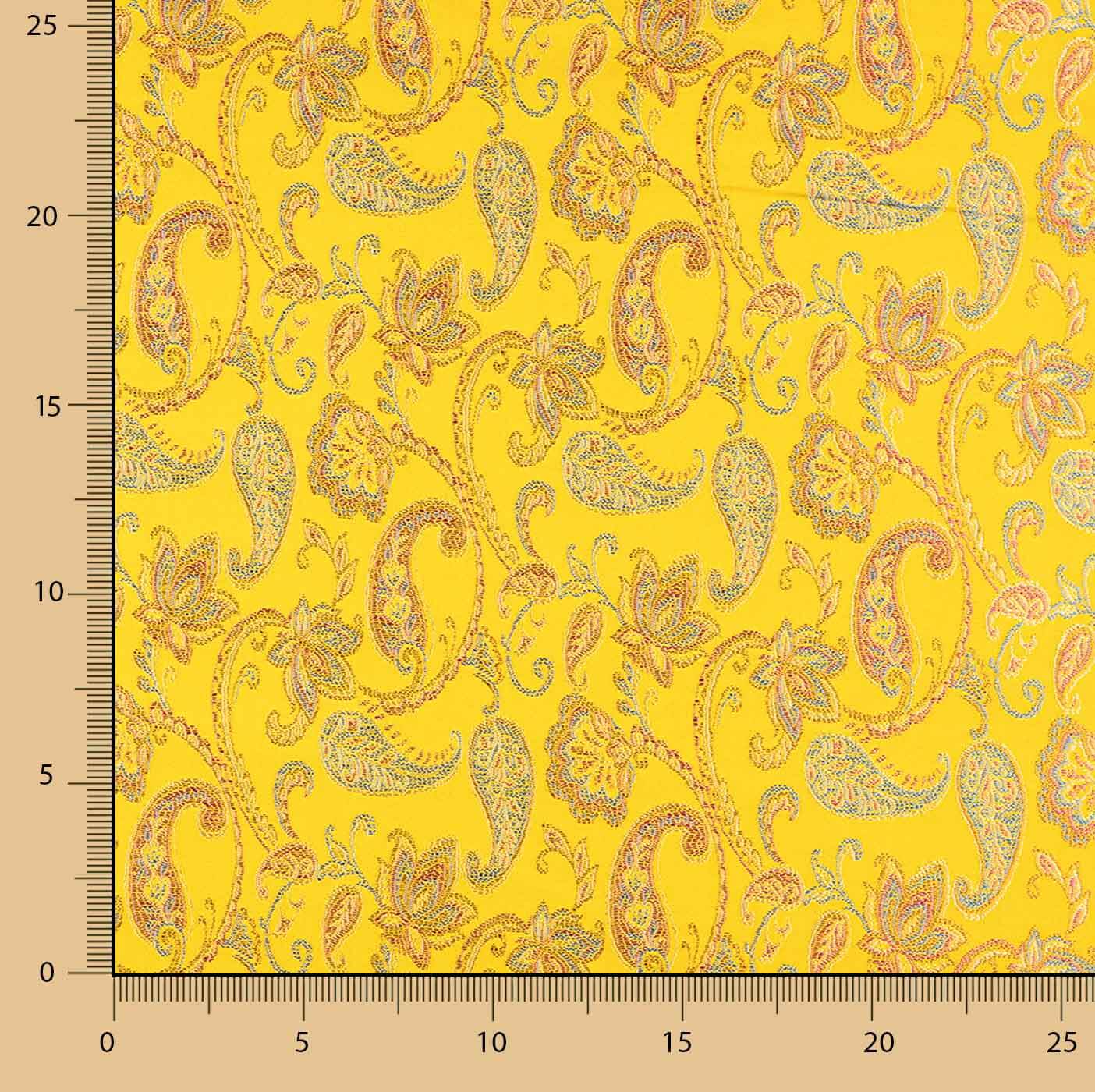 Tecido jacquard 100% poliéster com 110 cm de largura e um vibrante padrão cachemir sobre fundo amarelo intenso, que confere um brilho subtil e elegante. É um tecido fino, mas com corpo, suave ao toque e com estrutura sustentada, ideal para peças de moda, vestidos de cerimónia e figurinos para espetáculos. A trama de fios em diferentes tonalidades cria um efeito visual sofisticado e luminoso, conferindo um acabamento luxuoso a qualquer peça de vestuário. Também é perfeita para a criação de acessórios como bolsas, carteiras, estojos e artigos de marroquinaria, graças à sua consistência e acabamento festivo atraente.