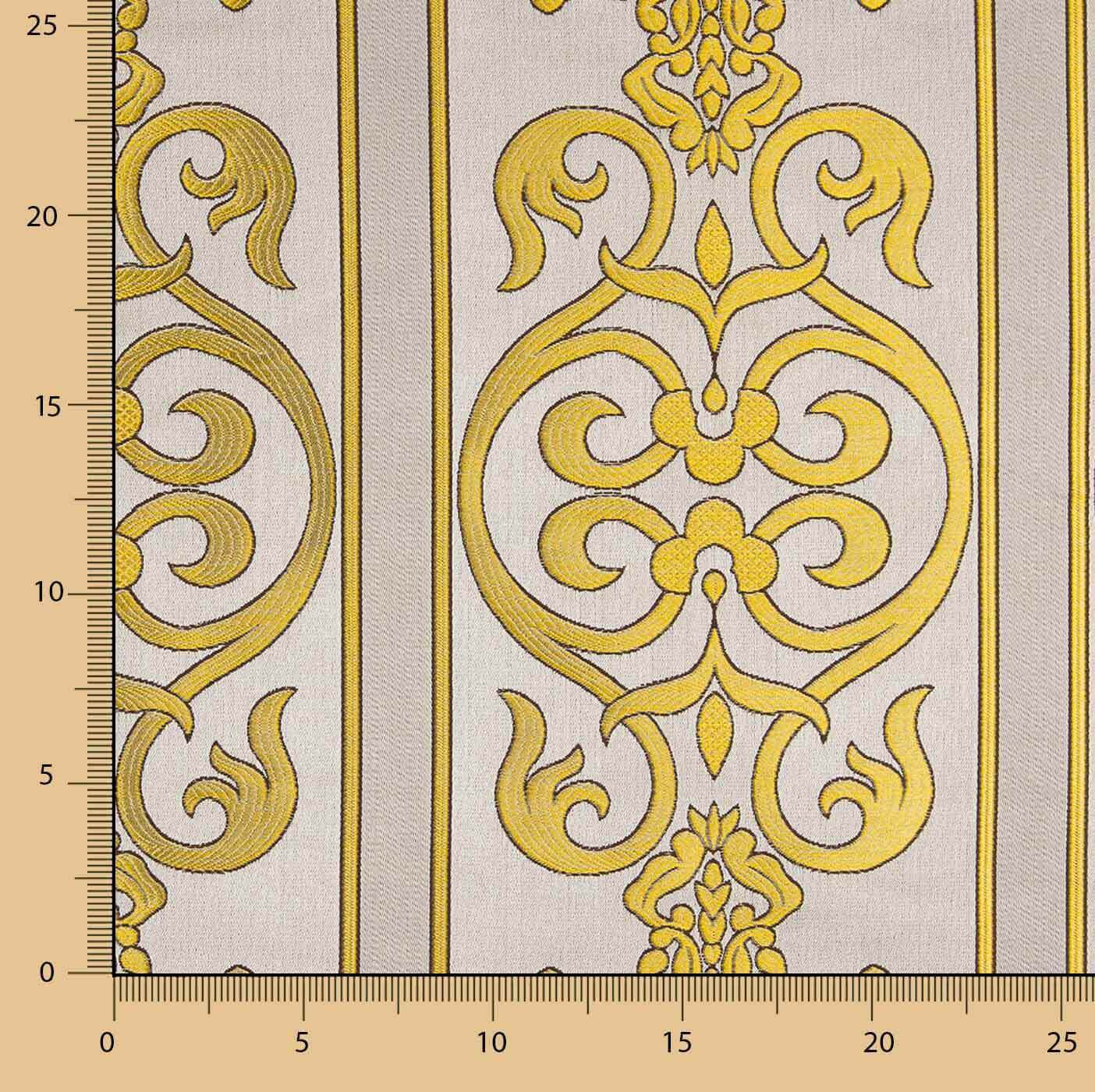 Tecido de brocado 100% poliéster com 140 cm de largura e elegante desenho litúrgico de cruzes ornamentais e motivos clássicos dispostos verticalmente sobre fundo marfim com desenho em tom dourado. A trama do tecido cria um leve brilho que realça o relevo do desenho, conferindo um acabamento solene e distinto. É um tecido resistente, com corpo e estrutura, ideal para a confeção de vestimentas religiosas, como casulas, estolas, capas pluviais e frontais de altar, bem como para decoração cerimonial. Também é perfeito para projetos de decoração e acessórios que exijam um tecido com presença, luxo e tradição.