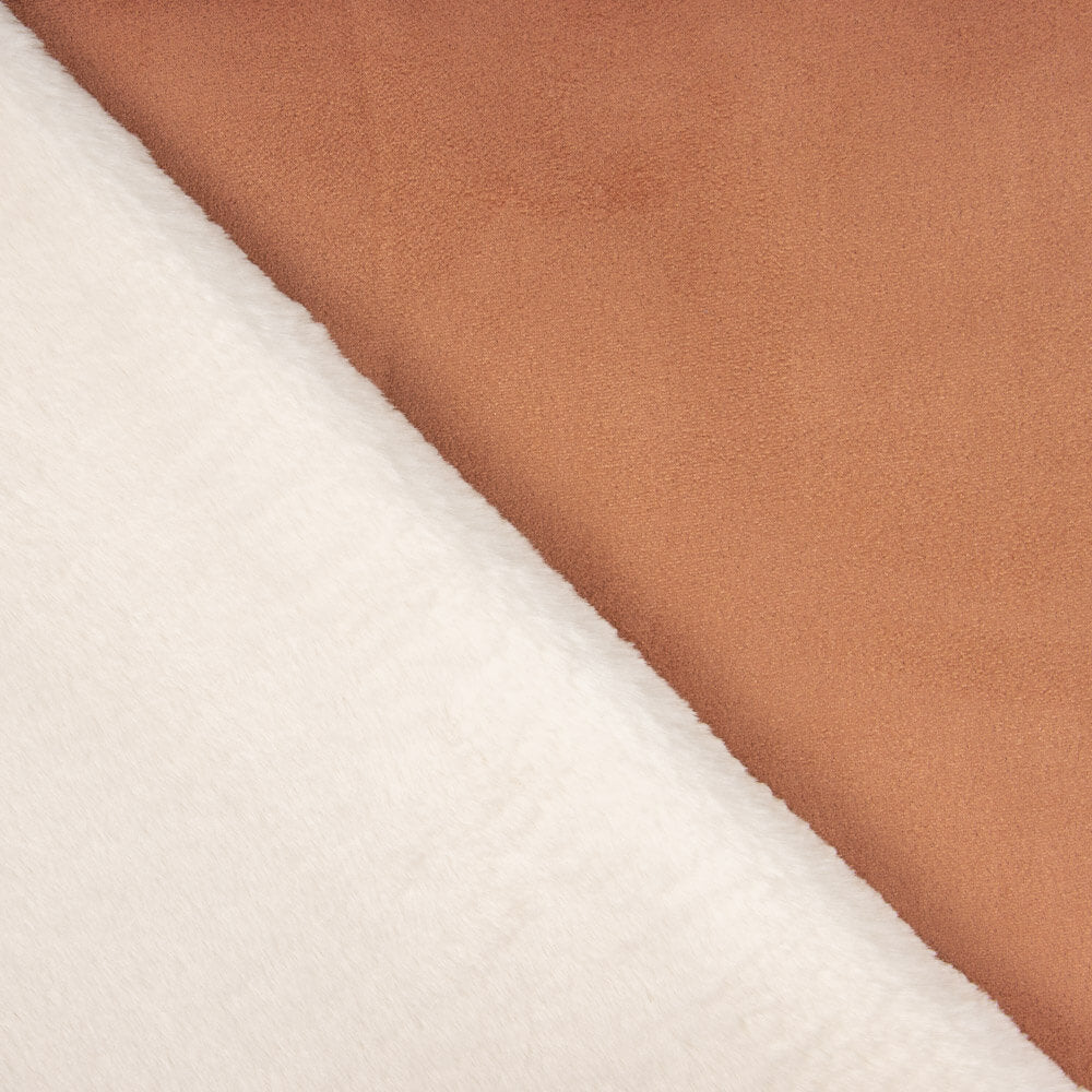 Tecido de dupla face com um acabamento de camurça cor de argila e um pelo curto liso cru muito macio e agradável ao tato. Tecido reversível e espesso de alta qualidade que pode ser utilizado nas duas faces. Subtilmente aveludado e suave ao tato no exterior, imitando a camurça. Tecido espesso e opaco em ambos os lados. Interior forrado com pelo curto de cor cru.  O pelo é um tecido que se caracteriza pelo seu calor, espessura e caimento. Pelo sintético ideal para a confeção de casacos e blusões, bem como de acessórios e complementos.