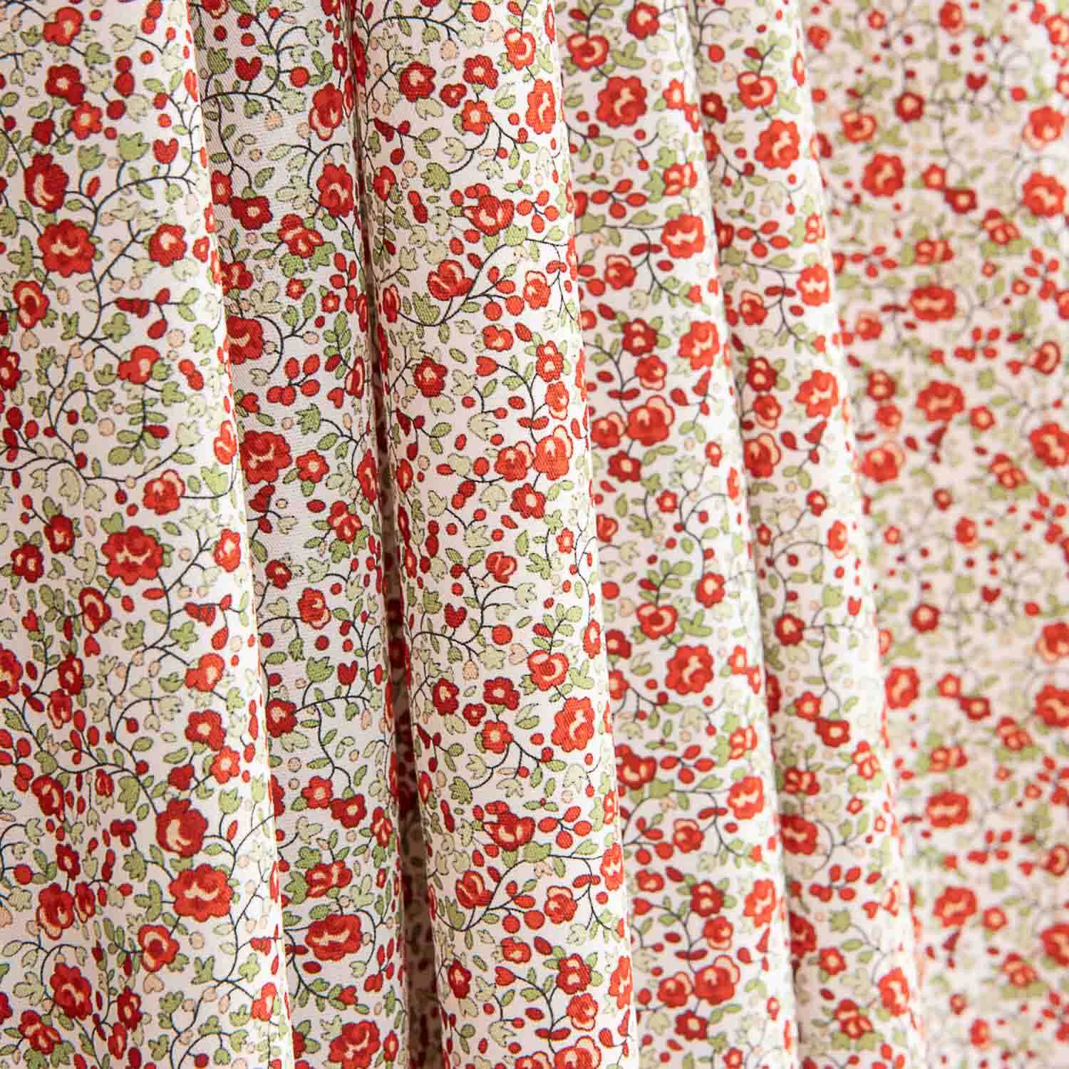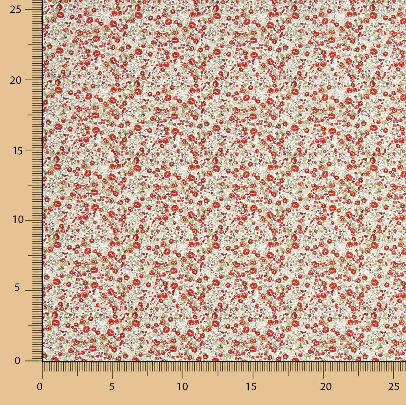 Tecido popeline 100% algodão com 150 cm de largura com estampado microfloral em tons de vermelho e verde sobre fundo claro. O popeline é um tecido fino, macio e com corpo, muito agradável ao toque e fácil de trabalhar. O seu design com pequenas flores tipo liberty torna-o ideal para patchwork, acessórios, decoração do lar, blusas, camisas e peças de vestuário leves. Por ser um tecido 100% algodão, recomenda-se lavá-lo antes de o manusear para evitar possíveis encolhimentos.