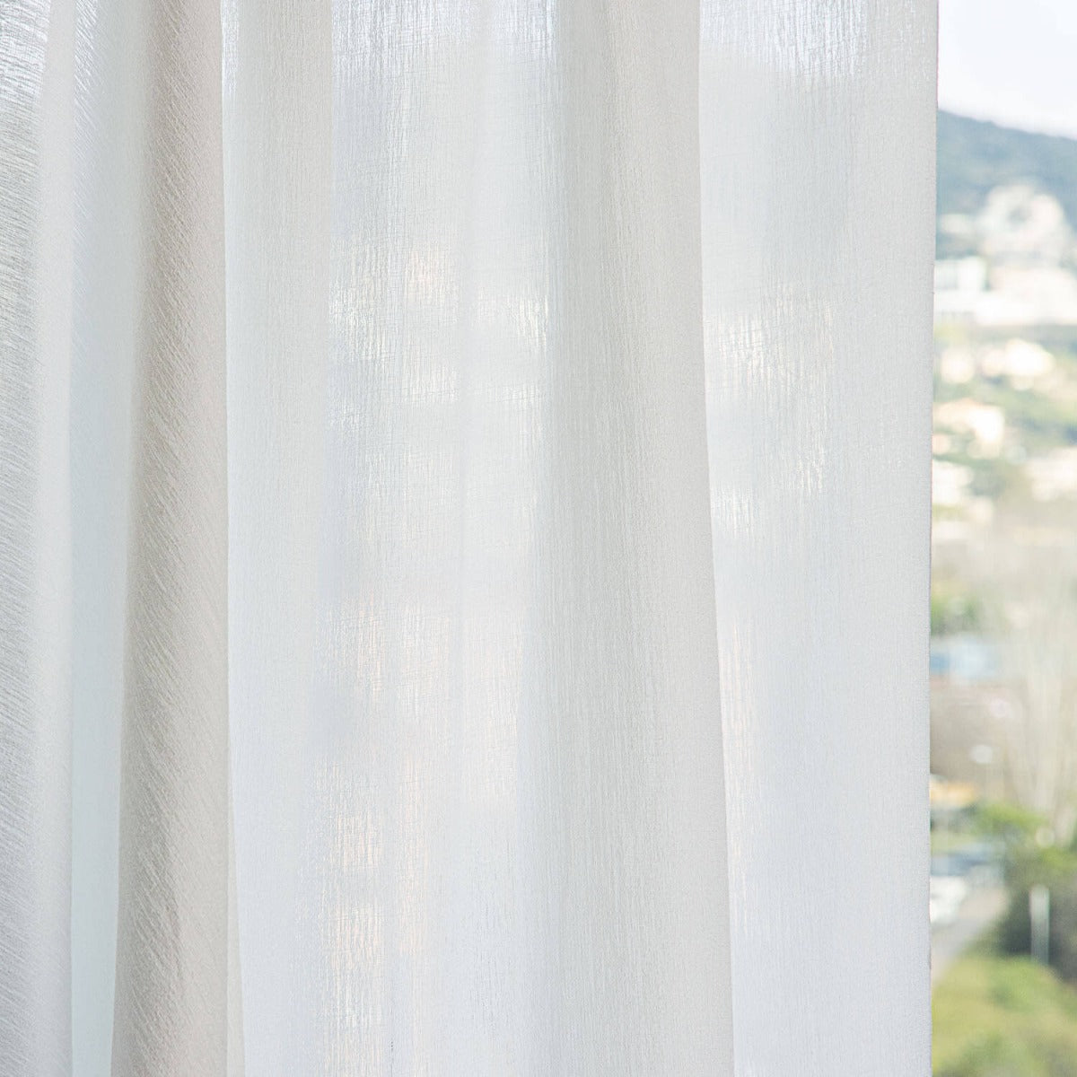 Tela de visillo a metros tipo crep rústico blanco natural. Tela de poliéster 100% con una caida y un tacto esquisito con una altura de 280cm. Es una tela de visillo translúcida con buena caída para confección de cortinas. Debido a su composición, es un tejido de muy fácil mantenimiento.
