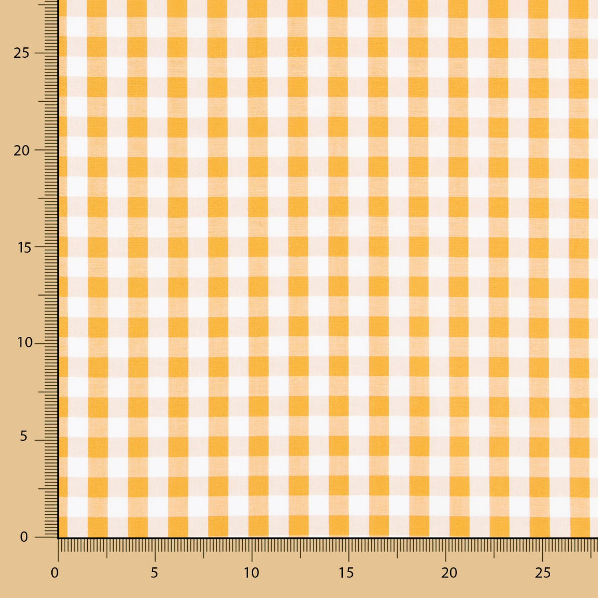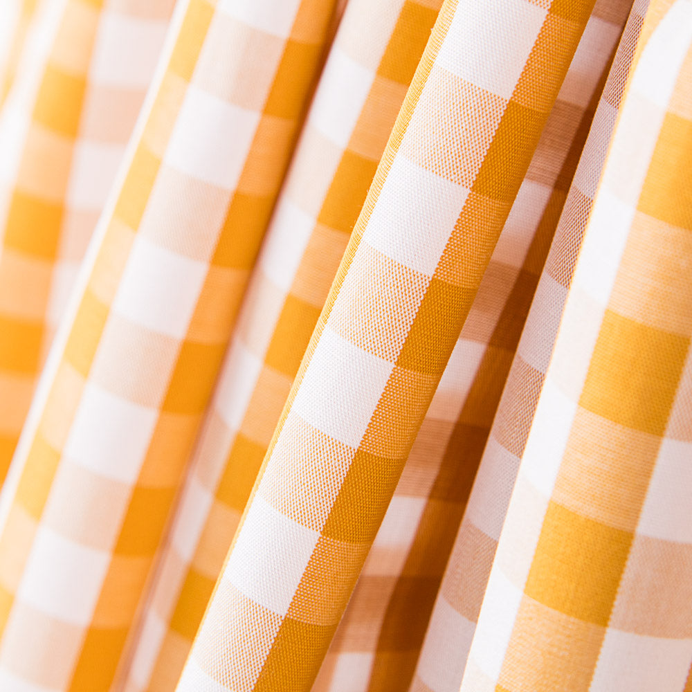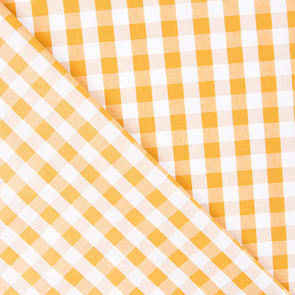 Tecido quadrado de algodão Vichy de 10mm amarelo torrado. A popelina de algodão é um tecido muito fino, macio e versátil. A popelina é um tecido básico ideal para fazer almofadas, lençóis, patchwork e todo o tipo de decorações.