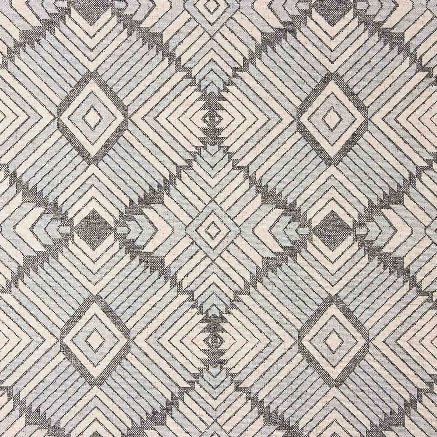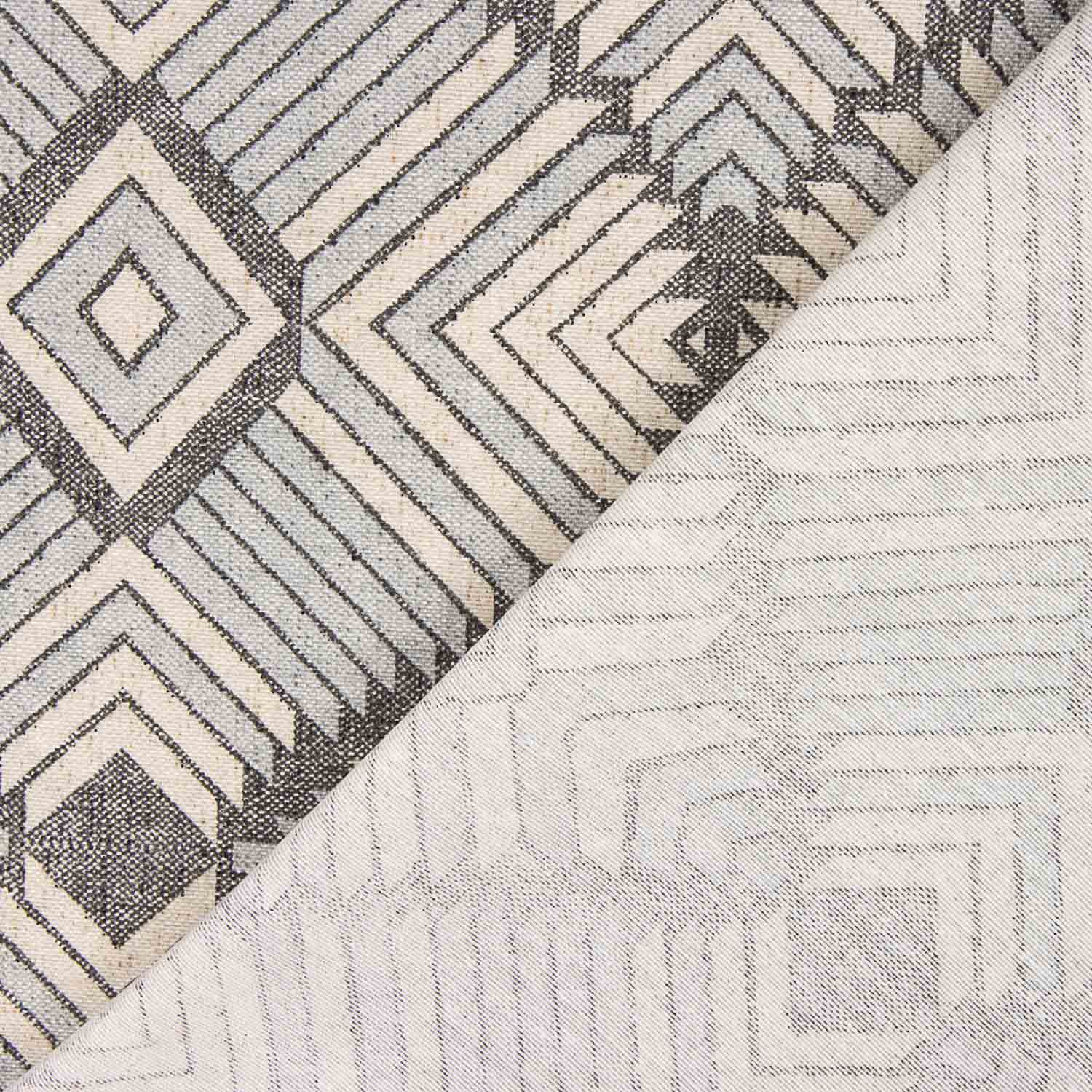 A Loneta Geométrica Étnica Gris apresenta um elegante estampado de inspiração étnica com motivos geométricos em forma de losangos e linhas escalonadas, combinando tons cinzentos, bege e suaves nuances naturais.