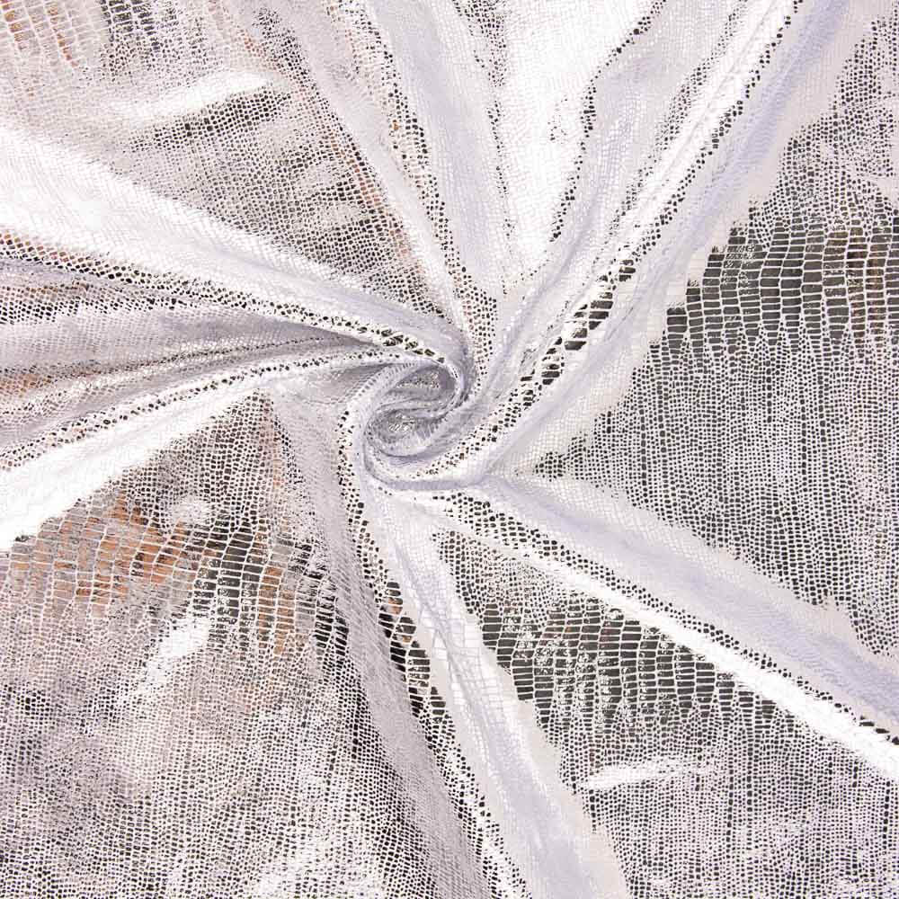 Tecido de veludo elástico na cor prata com um laminado brilhante em estampa semelhante a estampado reptil, ideal para criações que buscam se destacar com um toque ousado e glamoroso. Este tecido combina a suavidade luxuosa do veludo com a elasticidade do spandex, garantindo conforto e um ajuste perfeito. O laminado brilhante realça a estampa animal, proporcionando um acabamento deslumbrante e moderno. Ideal para peças de moda, fantasias e acessórios, esse tecido garante que seus designs sejam tanto elegantes quanto impactantes.