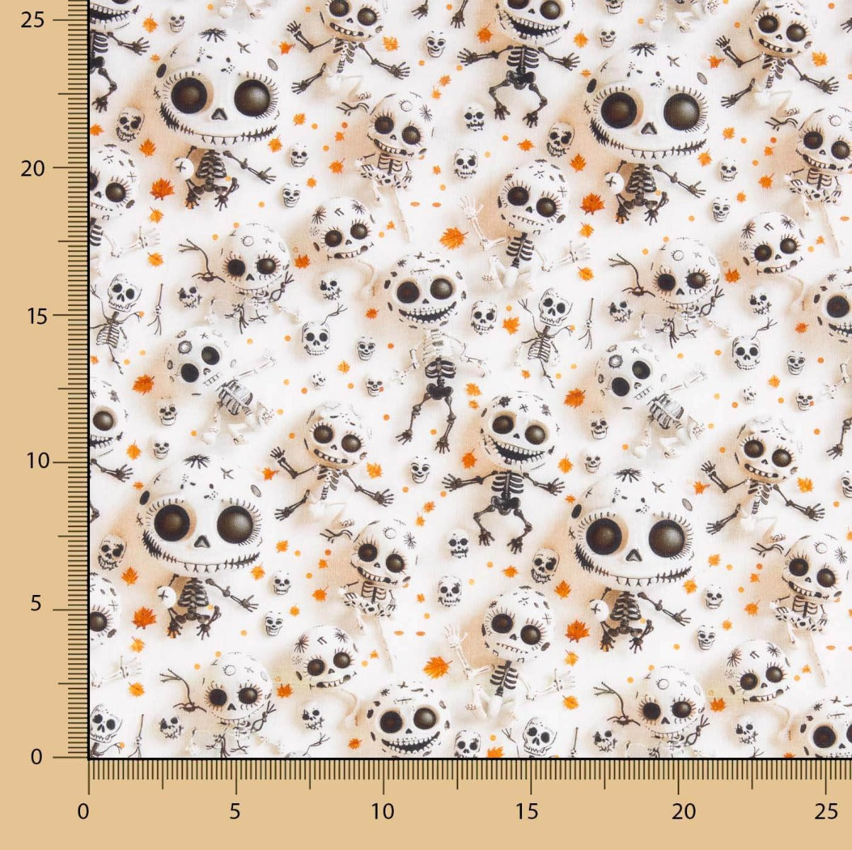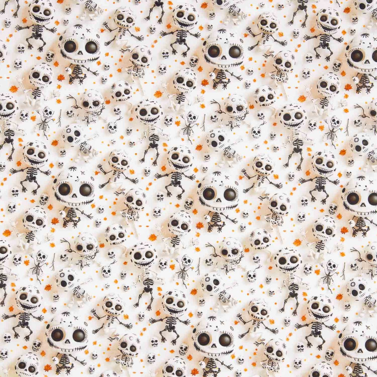 Tecido de popeline de algodão com estampado digital de desenhos “terroríficos” infantis de esqueletos, um estampado com leve sombreamento para um efeito 3D vivo em multicores. O popeline de algodão oferece uma textura suave, leve e durável, garantindo conforto e transpirabilidade. A impressão digital permite designs vibrantes e detalhados com precisão inigualável, trazendo um toque único e personalizado a cada peça. Esta combinação é ideal para uma ampla gama de projetos de confecção, como camisas, vestidos, blusas e acessórios, sendo muito utilizado também para trabalhos de patchwork.