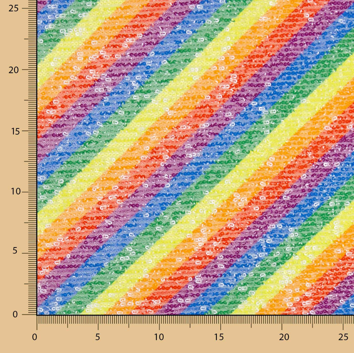 Lantejoula Pride multicolorida estampada com base em tule de lycra. Lantejoulas brilhantes e muito vistosas, finas, com muito caimento e de alta qualidade. A lantejoula é um tecido que confere elegância a peças de vestuário já prontas. Com este tecido de lantejoulas pretas, pode fazer as suas próprias saias brilhantes, vestidos de festa e todo o tipo de apliques de moda.