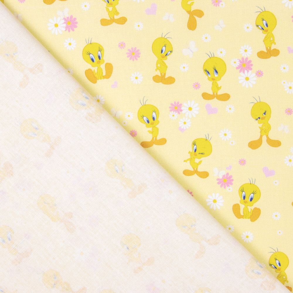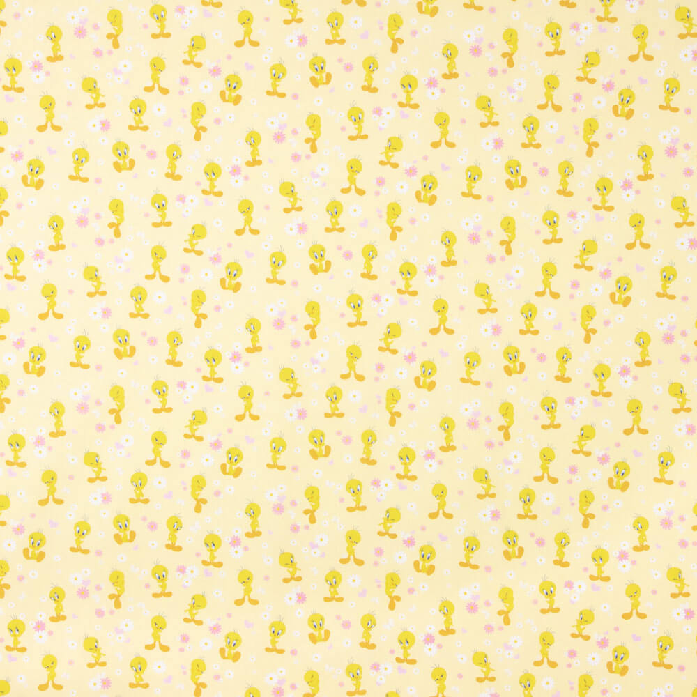Tecido de algodão grosso com estampado digital infantil de desenhos da personagem Piu-Piu. 100% algodão, estilo cretone. Tecido com um certo corpo, ideal para decorações e vestuário infantil. Tecido de algodão respirável, sustentado, caracterizado pela sua grande versatilidade. Sendo um tecido 100% algodão, é preferível efetuar uma pré-lavagem antes de o manusear.