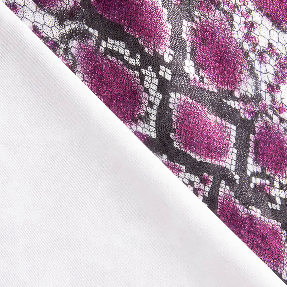Tecido de lycra com lâmina metálica com desenho de cobra cyclamen. O veludo é um item básico da moda, um tecido particularmente macio e aveludado, com muito caimento e ao mesmo tempo elegante. Outra característica do veludo é o efeito da água ao receber a luz, criada pelo acabamento do tecido. O veludo elástico é ideal para fazer vestidos, camisetas, saias e até calças.
