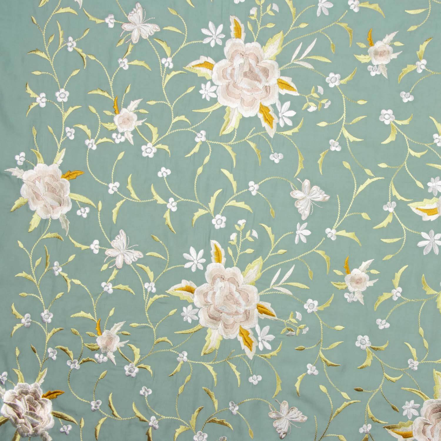 Tecido Tencel com bordados florais em verde mineral e bordados florais e borboletas. Perfeito para confeccionar elegantes mantos de flamenca e trajes de sevillana. Este tecido de alta qualidade combina a suavidade e o brilho do Tencel com a beleza dos bordados florais. O seu peso e caimento são ideais para conseguir um movimento espetacular e um acabamento impecável. Um tecido estrela para esta estação! Pode combiná-lo com tecido Tencel liso a condizer.