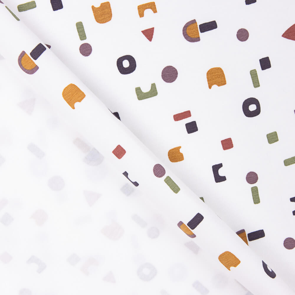 Tecido de algodão estampado com motivos geométricos coloridos sobre um fundo branco. O tecido de malha estampado para criança, composto por 95% de algodão e 5% de lycra, é a escolha ideal para peças de vestuário confortáveis e versáteis para os mais pequenos. O algodão proporciona suavidade e respirabilidade, enquanto a lycra confere elasticidade e flexibilidade. Os estampados infantis conferem um toque de diversão e personalidade a qualquer peça de vestuário confeccionada com este tecido, tornando-o perfeito para criar vestuário lúdico e prático para as crianças.