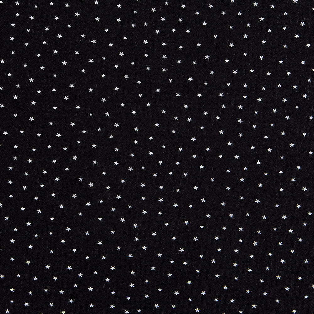 Tela de punto denim negra con estampado de estrellas blancas. Tela de punto de aspecto muy similar al denim o vaquero elástica, con cuerpo y mucha caída. Es un tejido ideal para la confección de vestidos, mallas y todo tipo de prendas ajustadas.