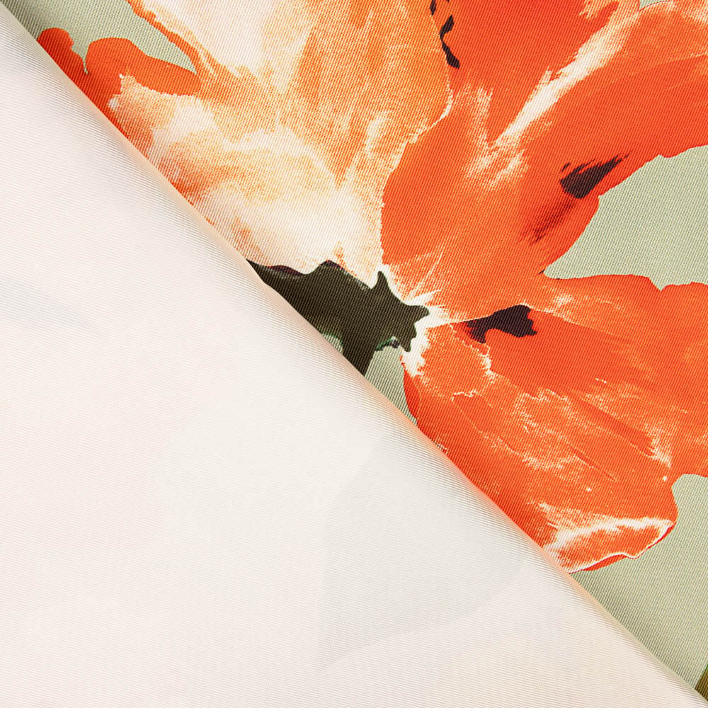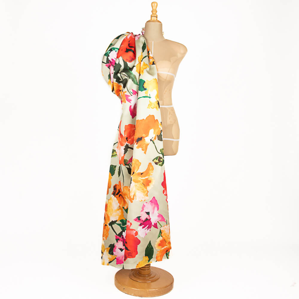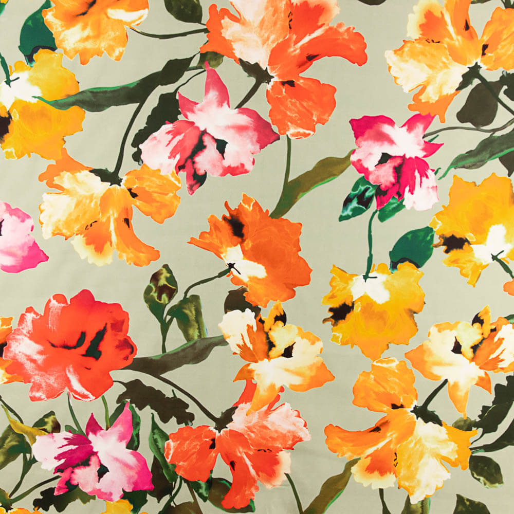 Tecido mikado estampado floral em cores contrastantes com fundo cinza pedra. O tecido Mikado é uma opção sofisticada e duradoura, perfeita para confeccionar peças de alta costura e decoração elegante. Com sua textura suave e ligeiramente brilhante, este tecido oferece um caimento estruturado que realça qualquer design. Ideal para vestidos de gala, saias volumosas e casacos elegantes, pois combina estilo e funcionalidade.