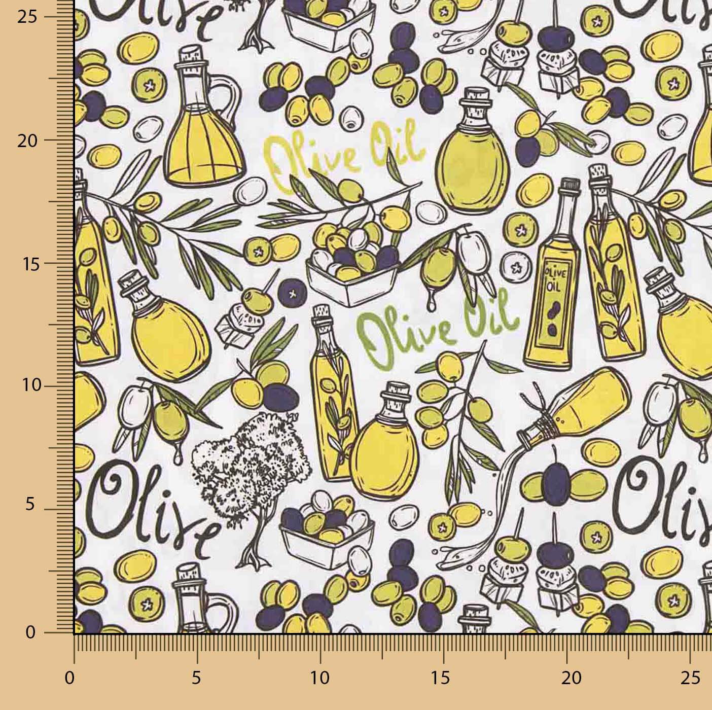 Este popeline de algodão 100%, com 150 cm de largura, apresenta um estampado gastronómico de garrafas de azeite, azeitonas e ramos de oliveira sobre fundo branco. Ideal para projetos de cozinha, aventais, toalhas de mesa, sacos ou decoração com temática mediterrânica. É um tecido suave, fácil de costurar e com muito charme rústico.