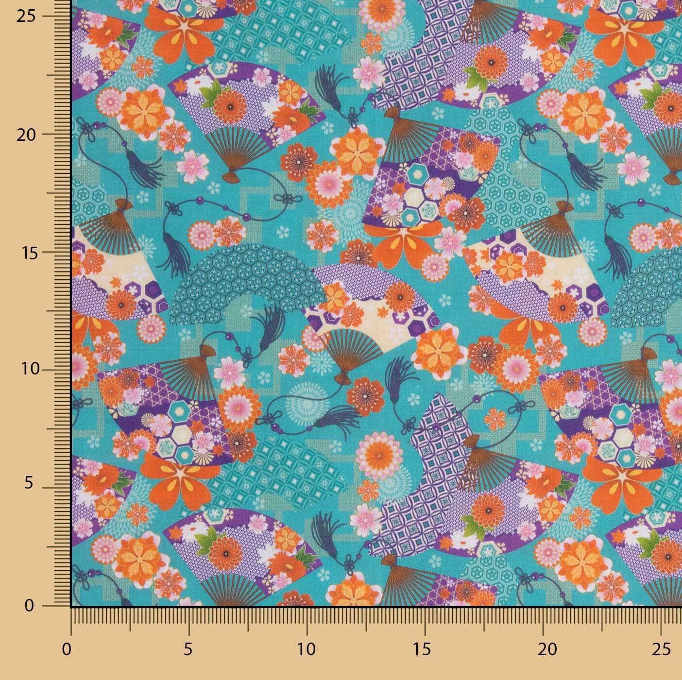 Este popeline de algodão 100% com 150 cm de largura apresenta um estampado japonês cheio de cor e dinamismo, com leques decorados, flores e grous sobre um fundo turquesa vibrante. Um tecido alegre, sofisticado e fácil de costurar, ideal para camisas, vestidos, bolsas, patchwork ou decoração com inspiração oriental.