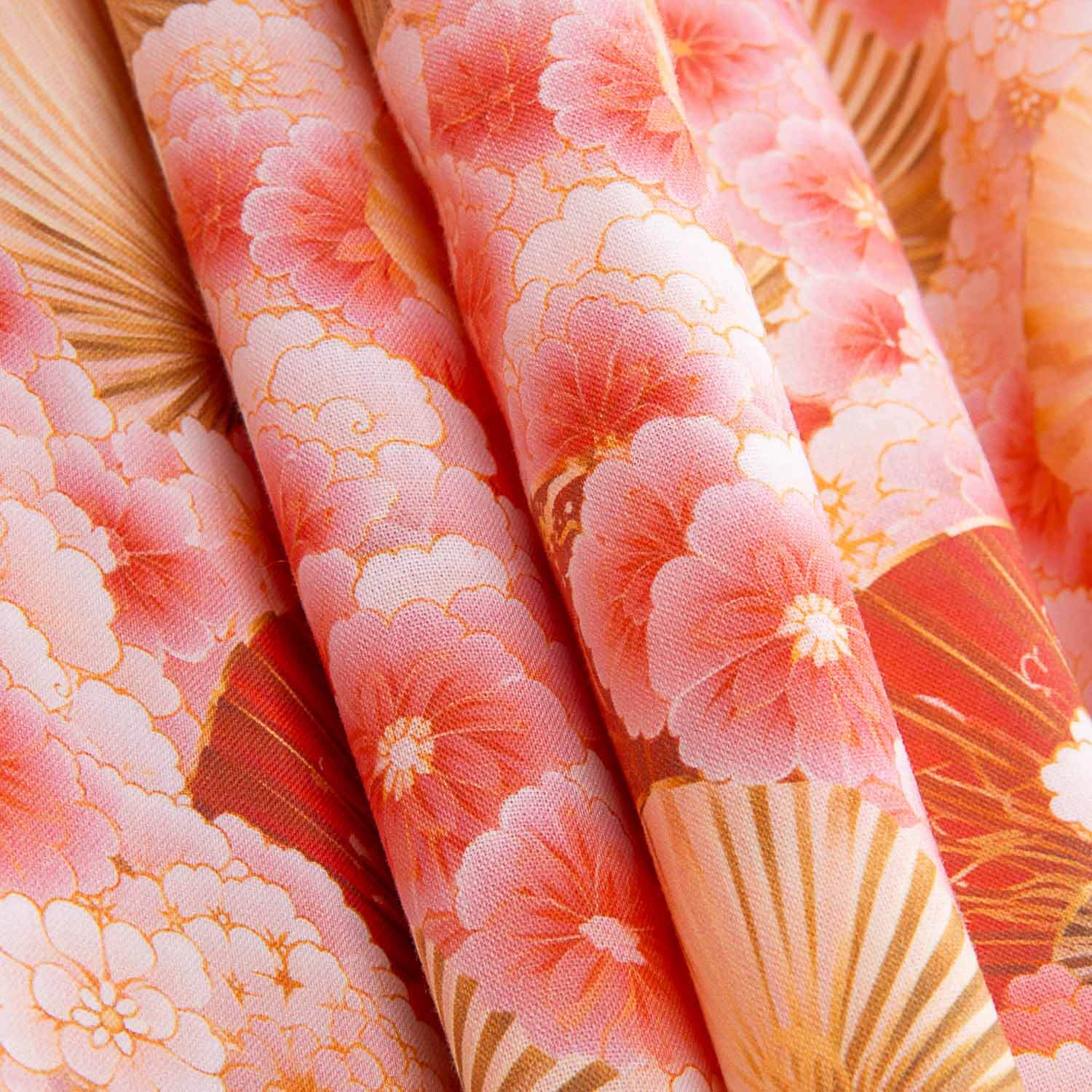 Este popeline de algodão 100%, com 150 cm de largura, apresenta um estampado japonês de leques em tons de marfim e vermelho, rodeados por flores de cerejeira em rosa e detalhes dourados. Um tecido romântico, elegante e com inspiração oriental, ideal para vestidos, blusas, patchwork, decoração ou acessórios delicados. A sua textura é suave, resistente e fácil de costurar.
