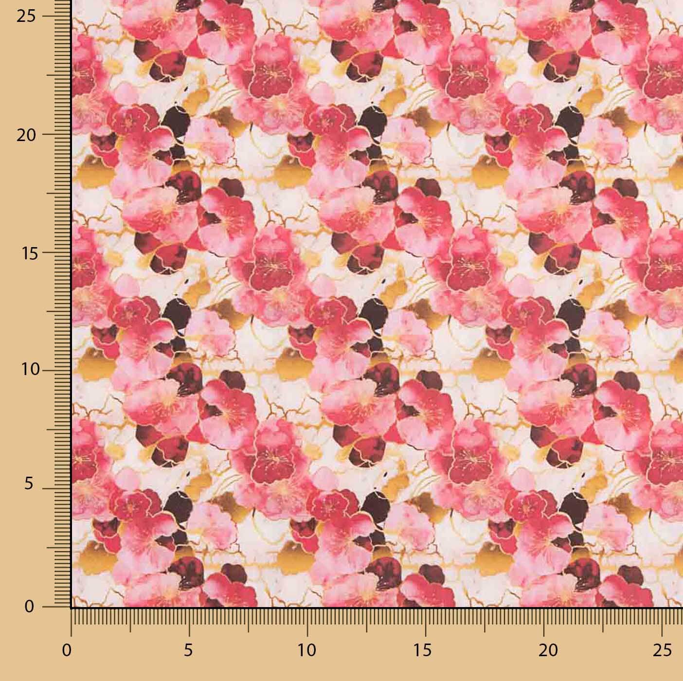 Popeline de algodão com um estampado floral chamativo tipo aquarela em tons de rosa, granada e dourado sobre fundo claro. A sua composição 100% algodão torna-o um tecido fresco, respirável e muito confortável para confecção. Largura de 150 cm. Ideal para camisas, vestidos, blusas, roupa infantil, acessórios e decoração do lar, como almofadas ou toalhas de mesa.