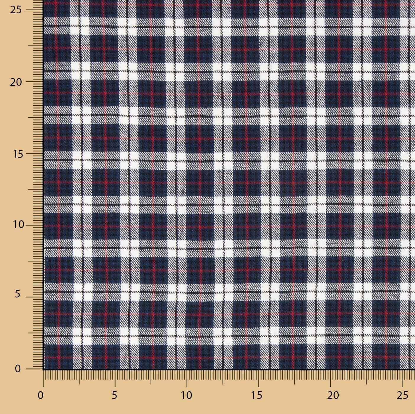 Este tecido de 100% algodão apresenta um design clássico de xadrez em tons de branco, azul marinho e detalhes bordô, ideal para peças intemporais com um toque elegante.