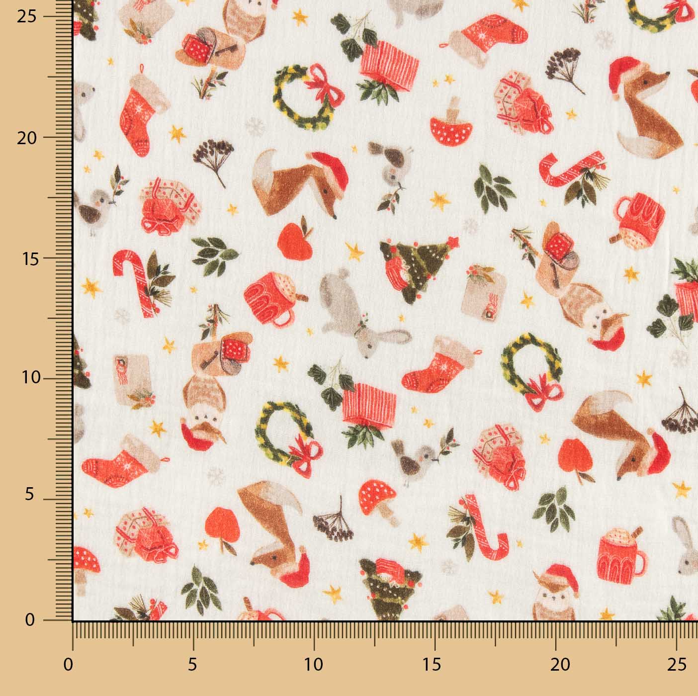 Tecido de bambula em algodão orgânico com estampado infantil de animais de Natal. A bambula ou gaze dupla de algodão é um tecido fresco e fluido, caracterizado pelas pregas que formam a estrutura e o corpo do tecido. É um tecido fino e opaco, pelo que não necessita de qualquer tipo de forro. Se procura um tecido de qualidade para vestidos de verão, saias, calças ou camisas, sem dúvida que a bambula de algodão irá satisfazer esses requisitos.