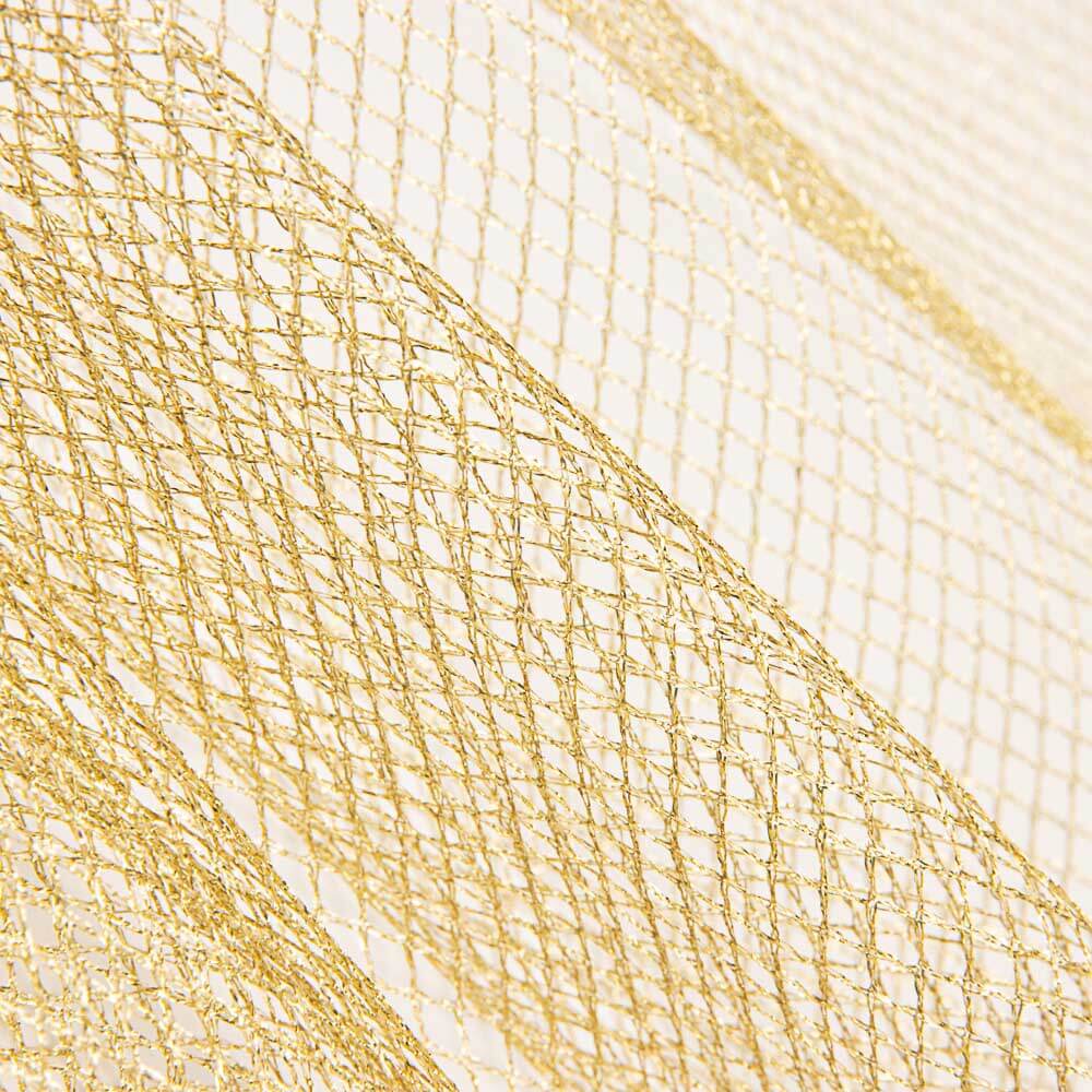 Rede metálica ouro para fantasias e decoração de festas. Rede semirrígida com malha vazada de aspecto brilhante, ideal para fantasias ou decoração de eventos.