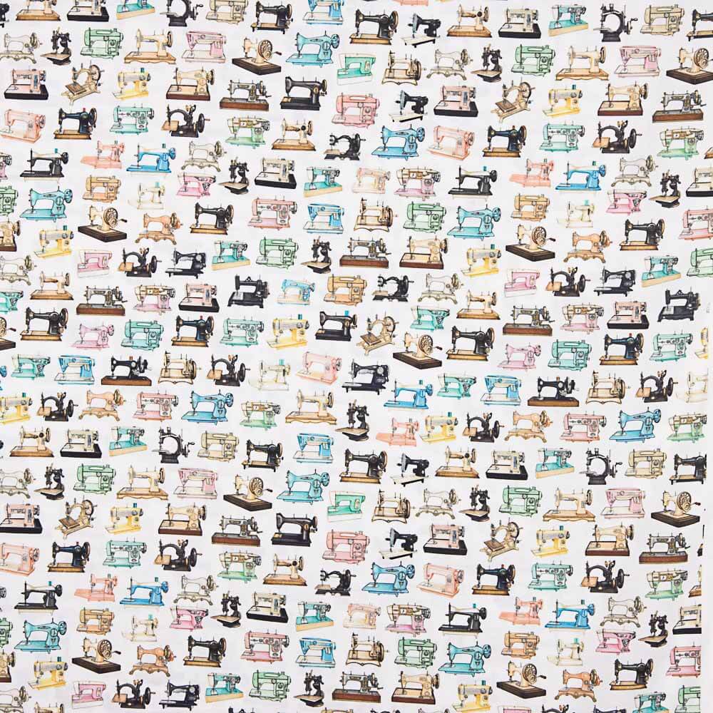 Patchwork de algodão para costura com estampado de máquinas de costura. Tecido 100% algodão de grande qualidade, macio e suave. Popeline ideal para a confeção de lençóis, almofadas, cortinas e acessórios como sacos de toilette, capas e bolsas. Também é perfeito para criações de patchwork e bordados.