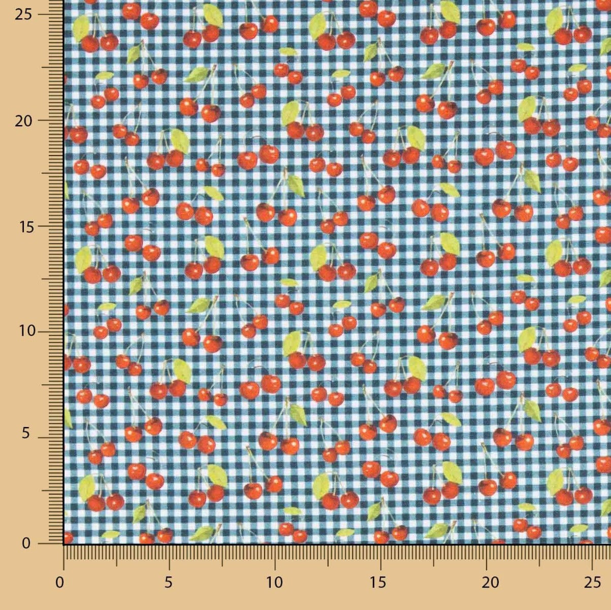 Algodón de Patchwork para labores y prendas de verano con estampado cereza vichy oscuro. Tela de algodón 100% de gran calidad, sostenida y suave. Popelín ideal para confección de sábanas, cojines, cortinas y accesorios como neceseres, fundas y bolsas. También es perfecta para creaciones de patchwork y labores.
