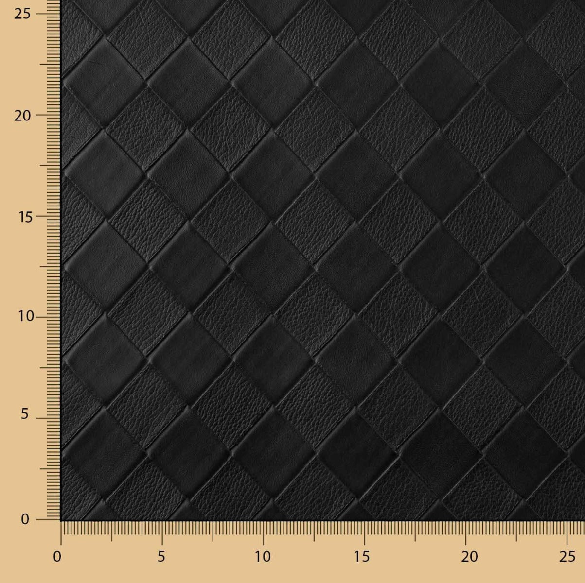 Tecido de couro sintético em elegante cor preta, com um desenho de losangos em leve relevo que combina texturas mate e granuladas, conseguindo um efeito visual sofisticado e moderno. A sua base de poliéster com efeito de feltro fino proporciona resistência e flexibilidade, enquanto a camada de PVC lhe confere durabilidade e fácil limpeza. Ideal para projetos de estofamento, marroquinaria, decoração, cabeceiras, bolsas, acessórios e confecção de peças com caráter contemporâneo.