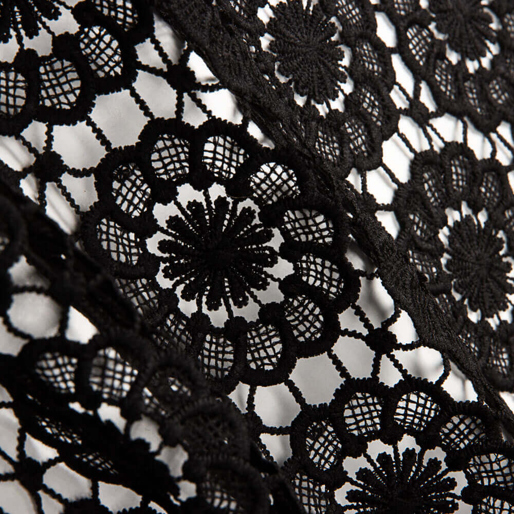 Tecidos vazados em renda grossa com desenho floral preto. Este tipo de tecido apresenta um desenho feito de uma infinidade de fios tecidos entre si e sem pano de fundo.