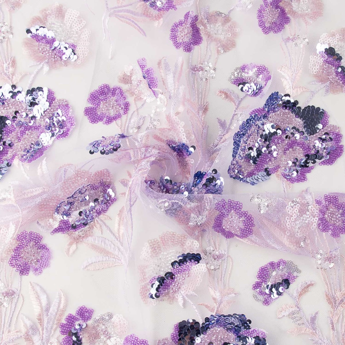 Tela de pedrería con lentejuela modelo primavera tono lila con peso. Base de tul transparente de color blanco bordado con cristales y lentejuelas en tonos a juego que aportan destellos y brillos en tus creaciones.