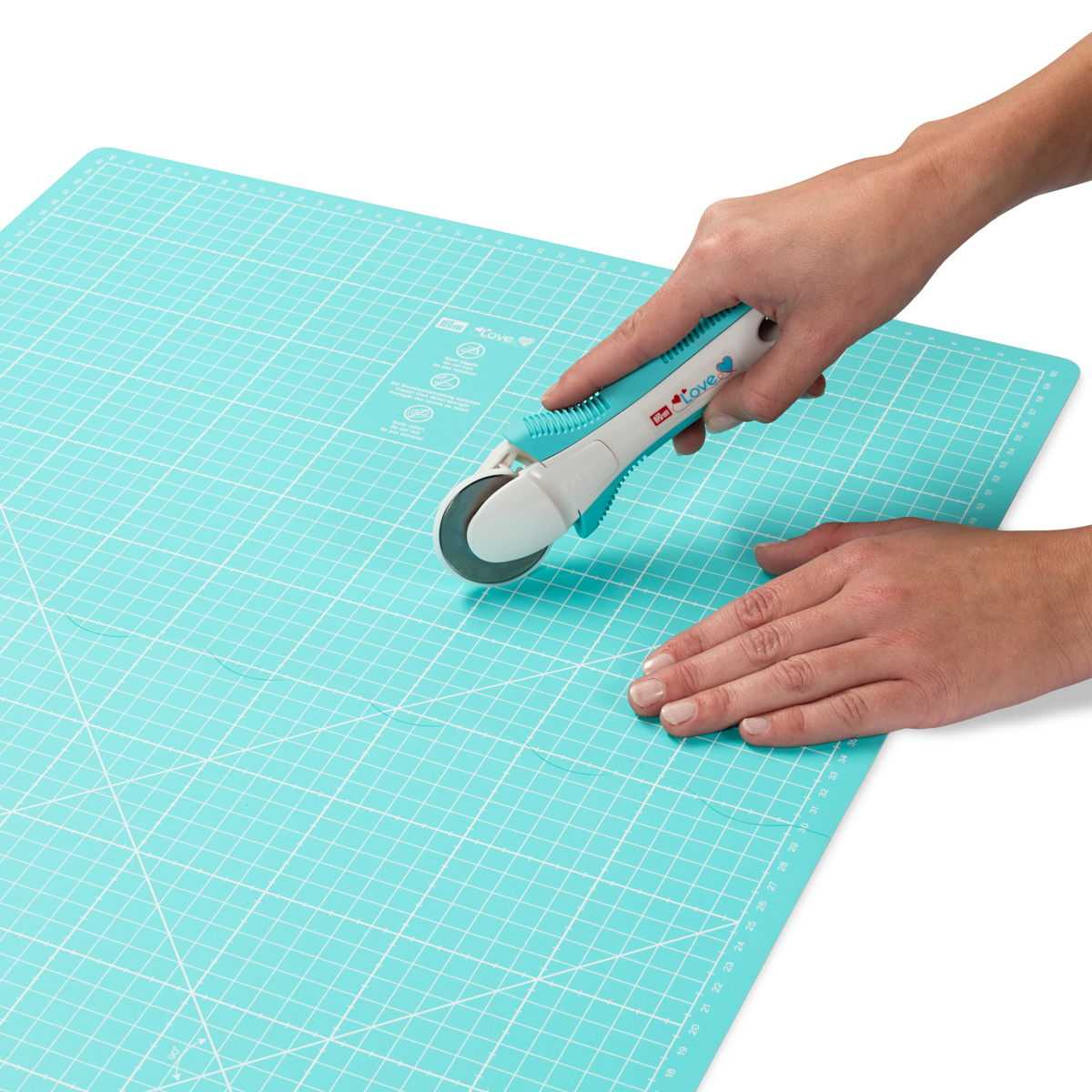 Base de corte de 60 cm x 45 cm Prym "LOVE" muito prática para quem tem pouco espaço, já que depois de dobrada mede 30 cm x 45 cm. Especialmente projetada para ser usada com o cortador circular "Prym". Não expor ao calor e não dobrar. Marcada em branco sobre fundo turquesa.