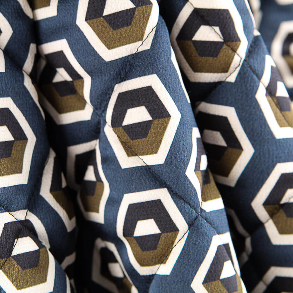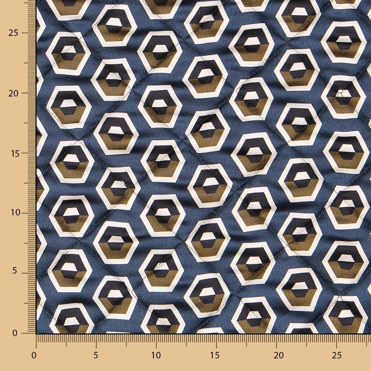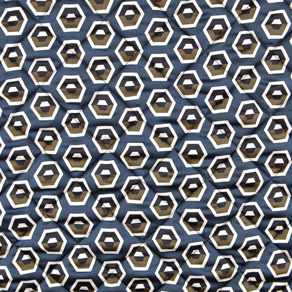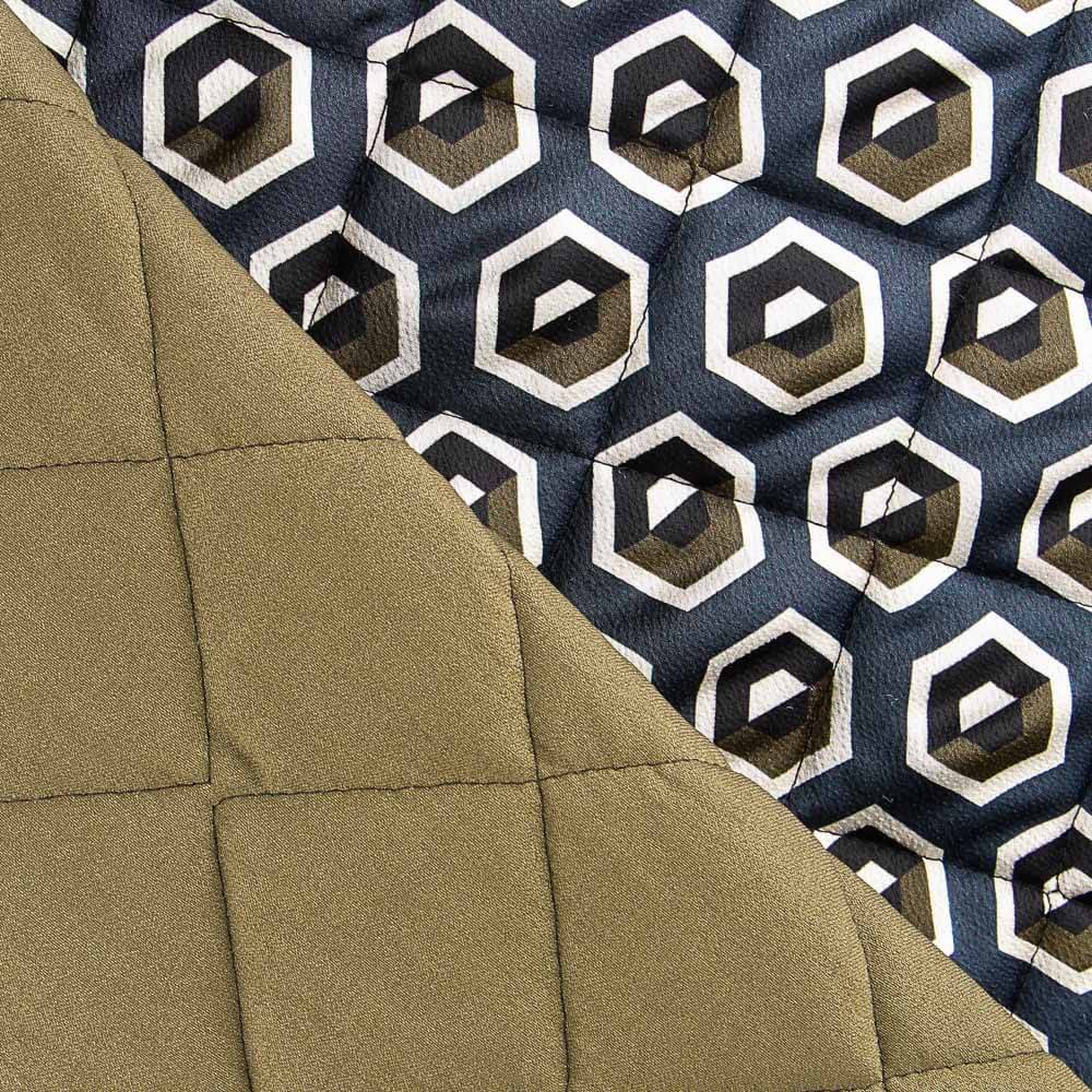 Tecido acolchoado em verde militar com estampagem geométrica verde no interior. Tecido com enchimento acrílico e volume para acessórios infantis. Tecido de algodão acolchoado de duas faces.