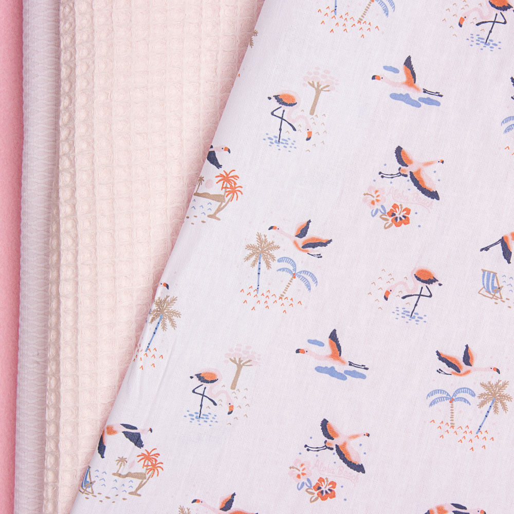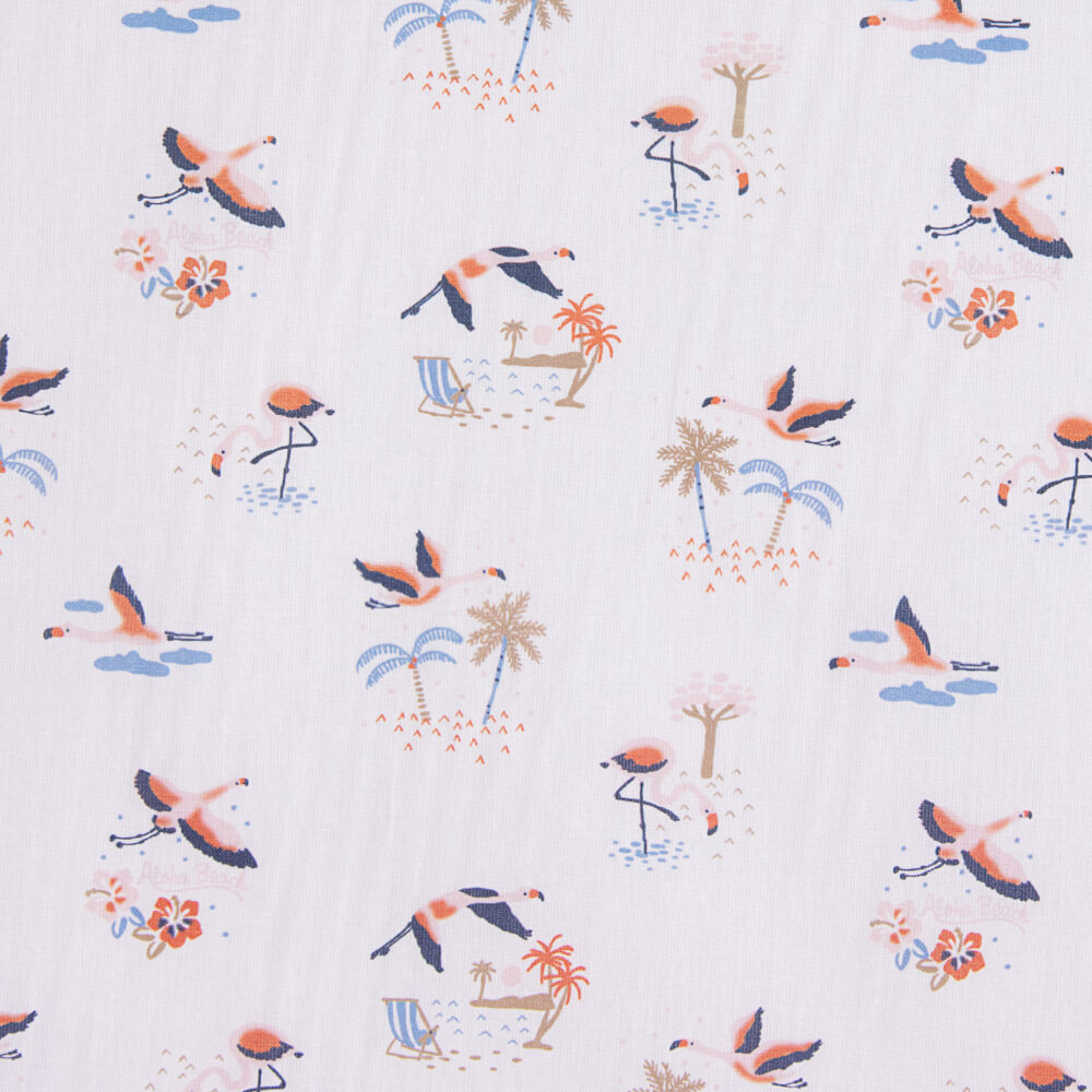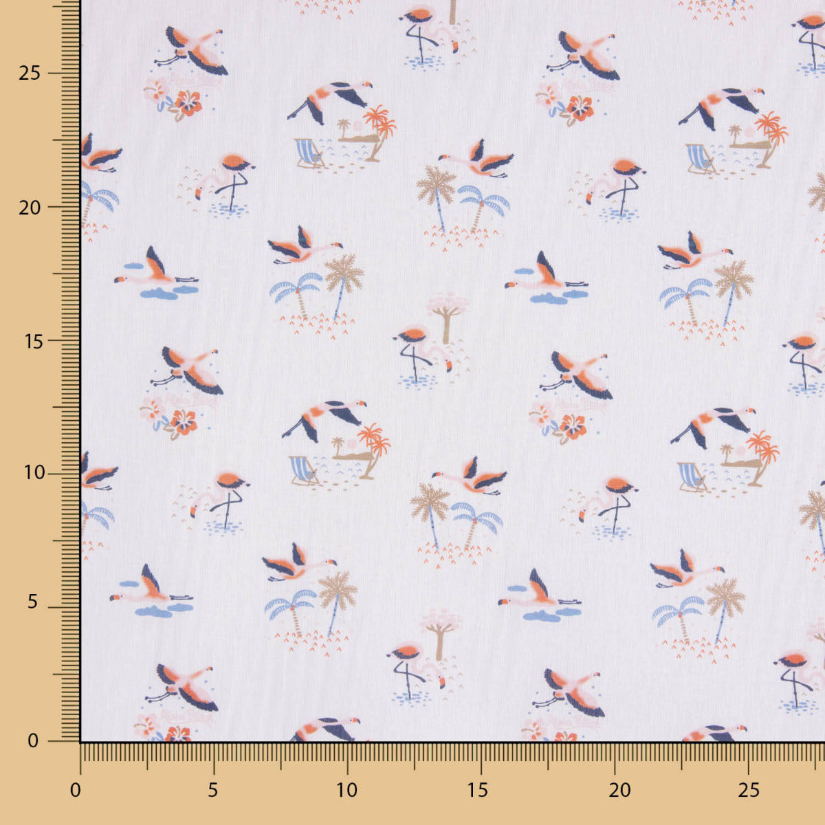 Tecido de algodão estampado com desenhos de palmeiras e flamingos sobre fundo branco. A popeline de algodão é um tecido durável, fino, muito macio e muito versátil. A popeline é um tecido básico ideal para fazer almofadas, lençóis, patchwork e todo tipo de decoração.