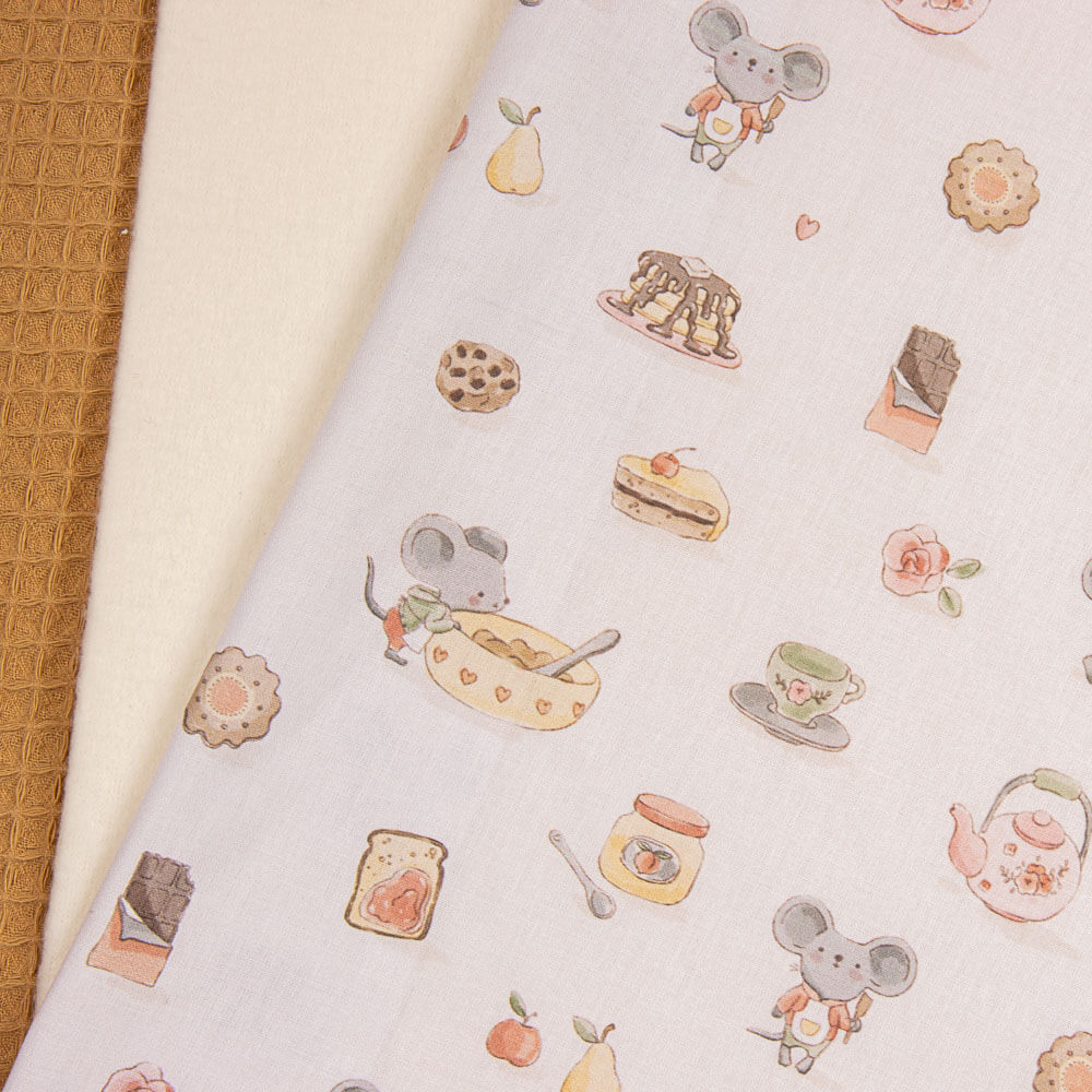 Tecido de algodão com doce estampado de desenhos de animais e bolos sobre base branca. A popeline de algodão é um tecido durável, fino, muito macio e muito versátil. A popeline é um tecido básico ideal para fazer almofadas, lençóis, patchwork e todo tipo de decoração.