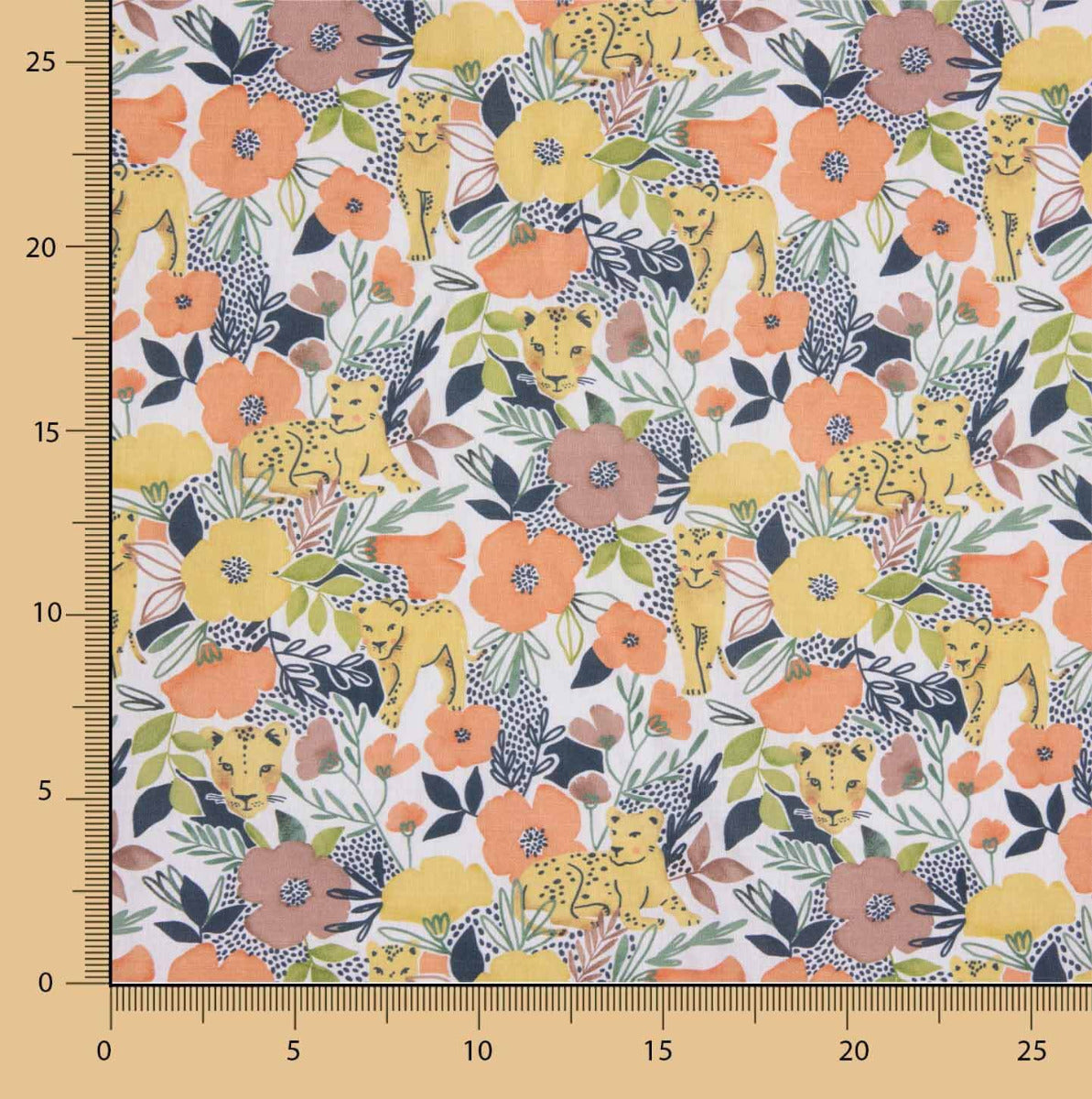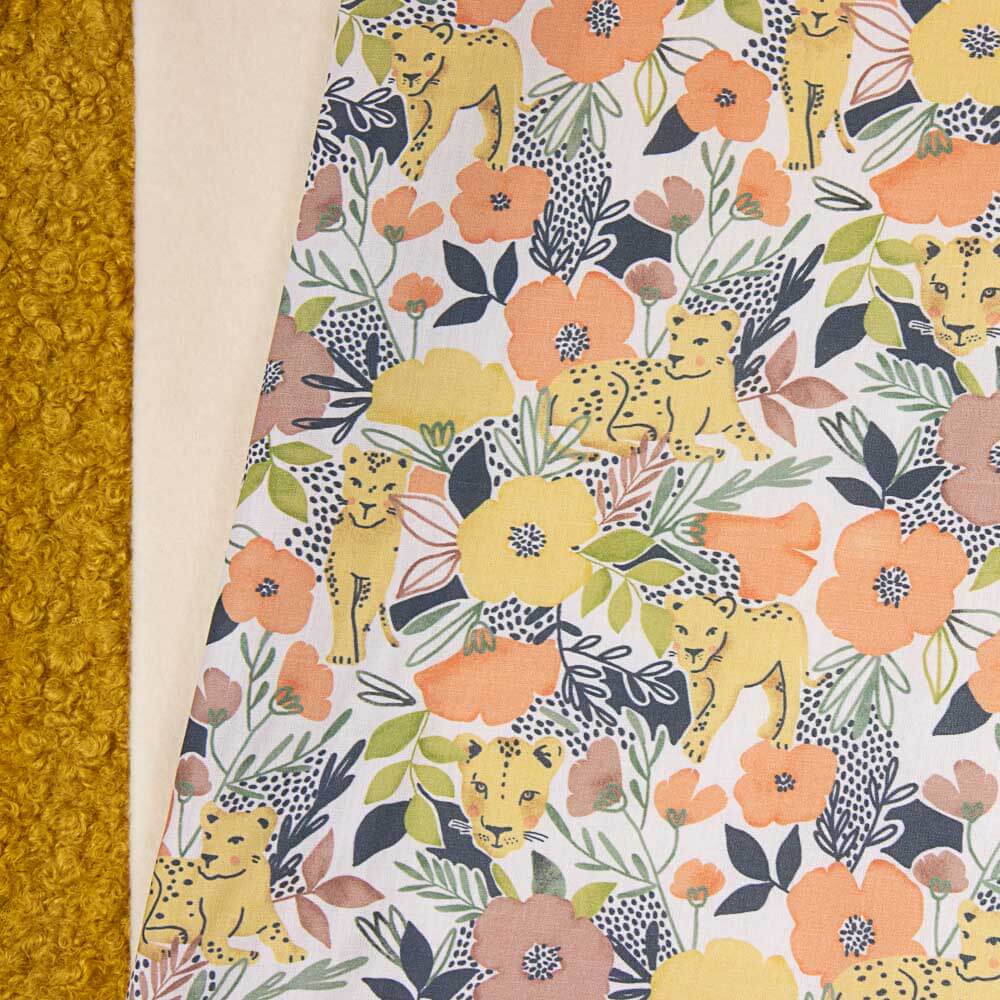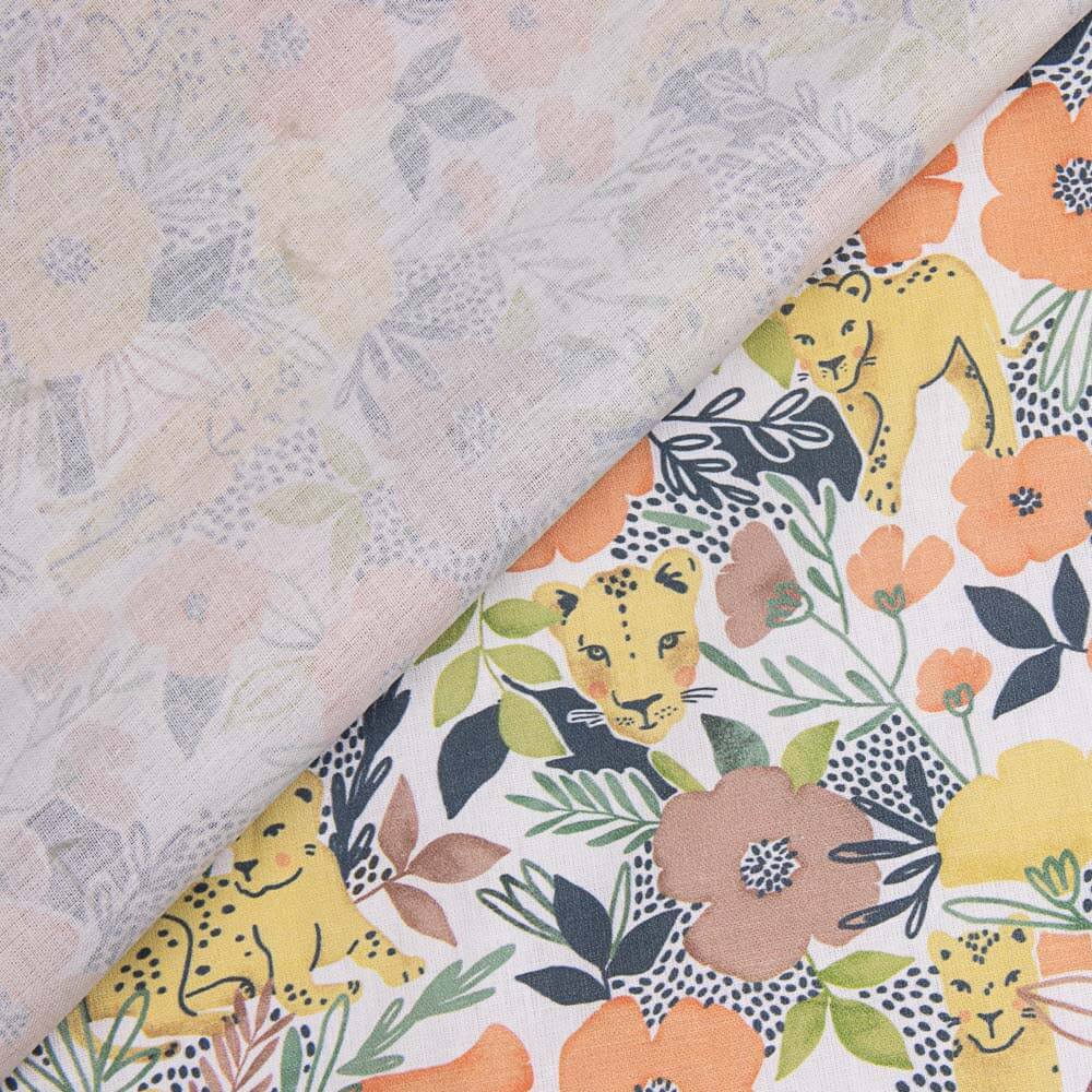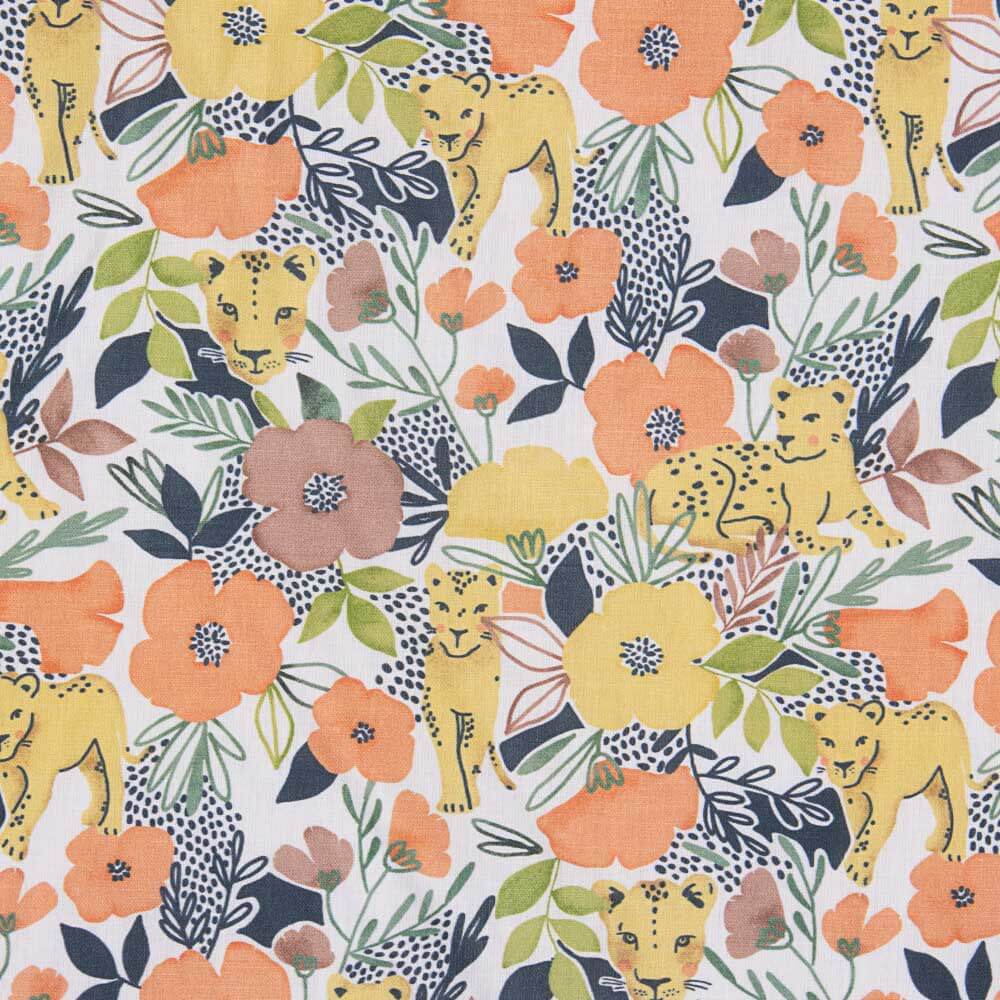 Tecido de algodão estampado com desenhos de leões sobre base branca. A popeline de algodão é um tecido durável, fino, muito macio e muito versátil. A popeline é um tecido básico ideal para fazer almofadas, lençóis, patchwork e todo tipo de decoração.
