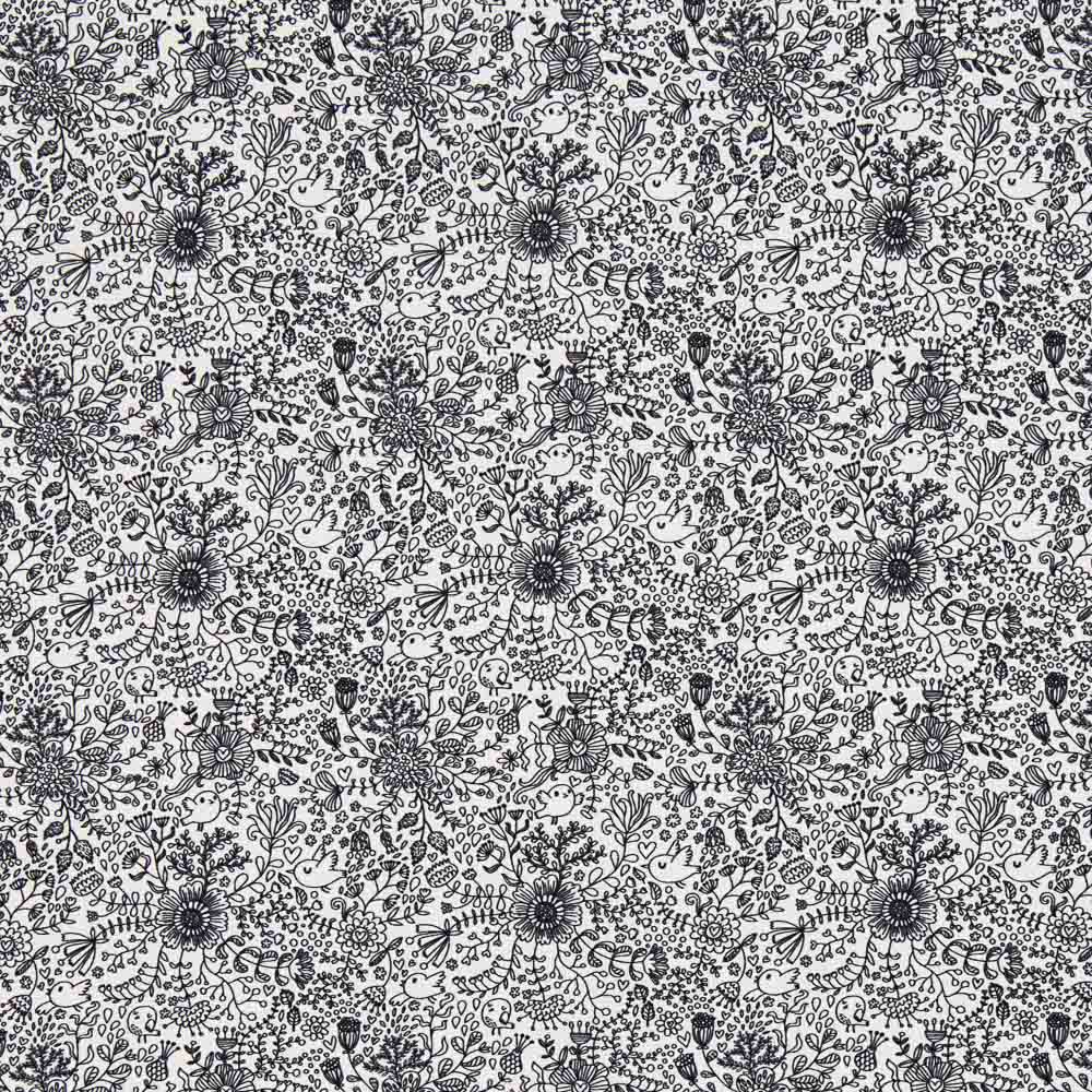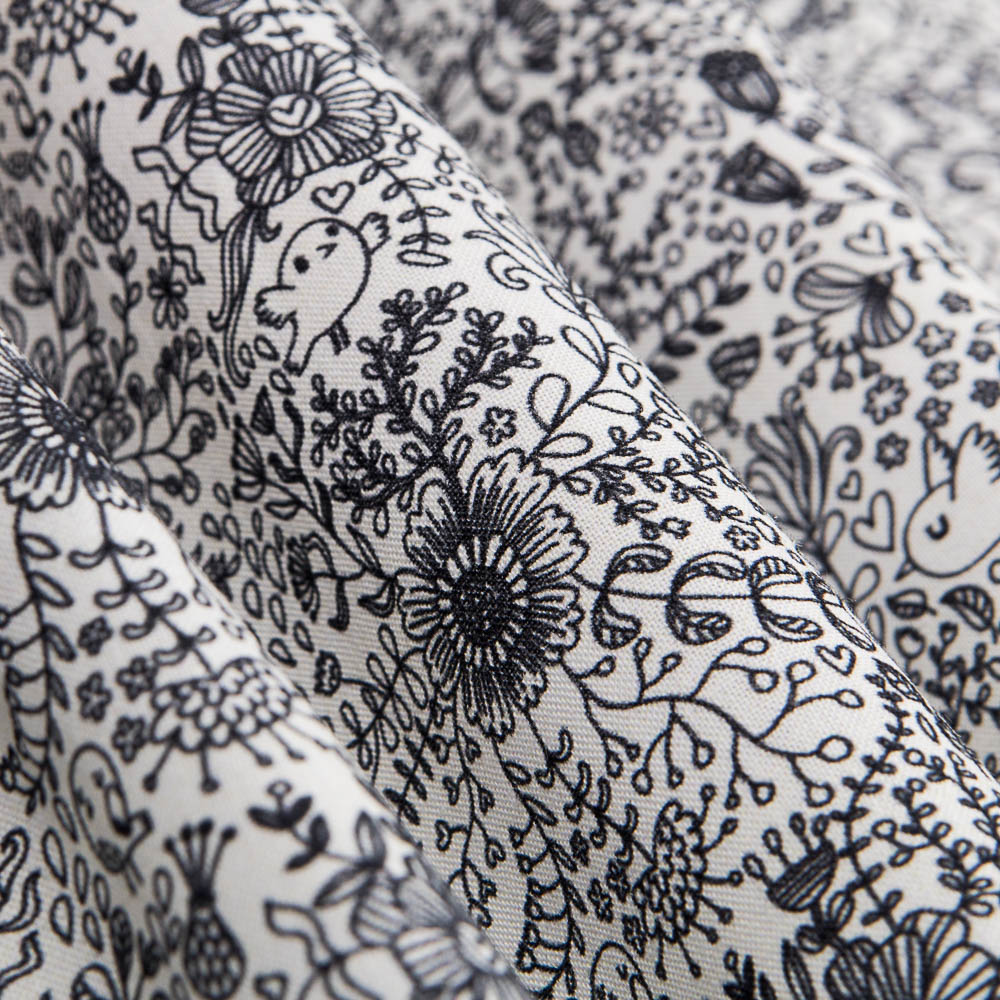 Algodão tipo percale com estampa de floresta mágica preto. Tecido de algodão orgânico certificado pelo ICEA de alta qualidade, sustentado e macio. Poplin ideal para fazer lençóis, almofadas, cortinas e acessórios tais como sacos de viagem, capas e bolsas. É também perfeito para criações de patchwork.