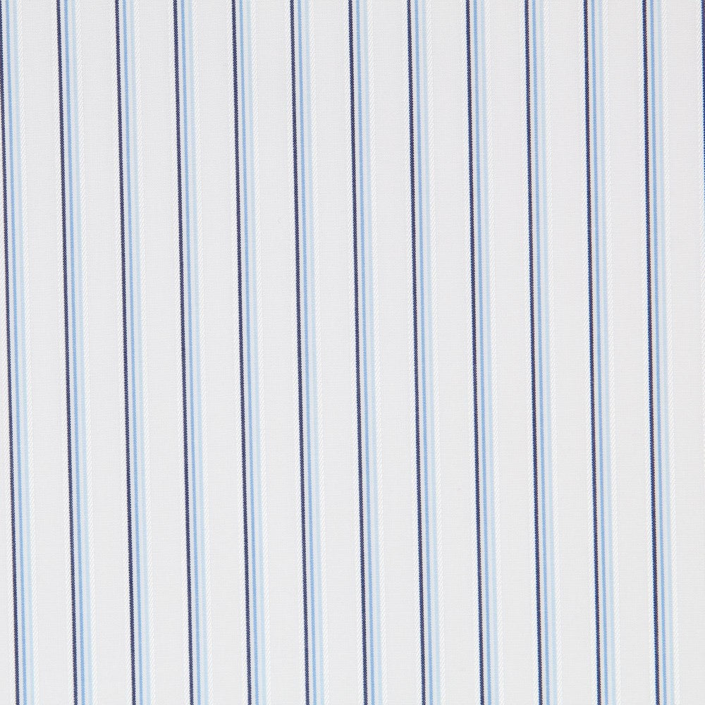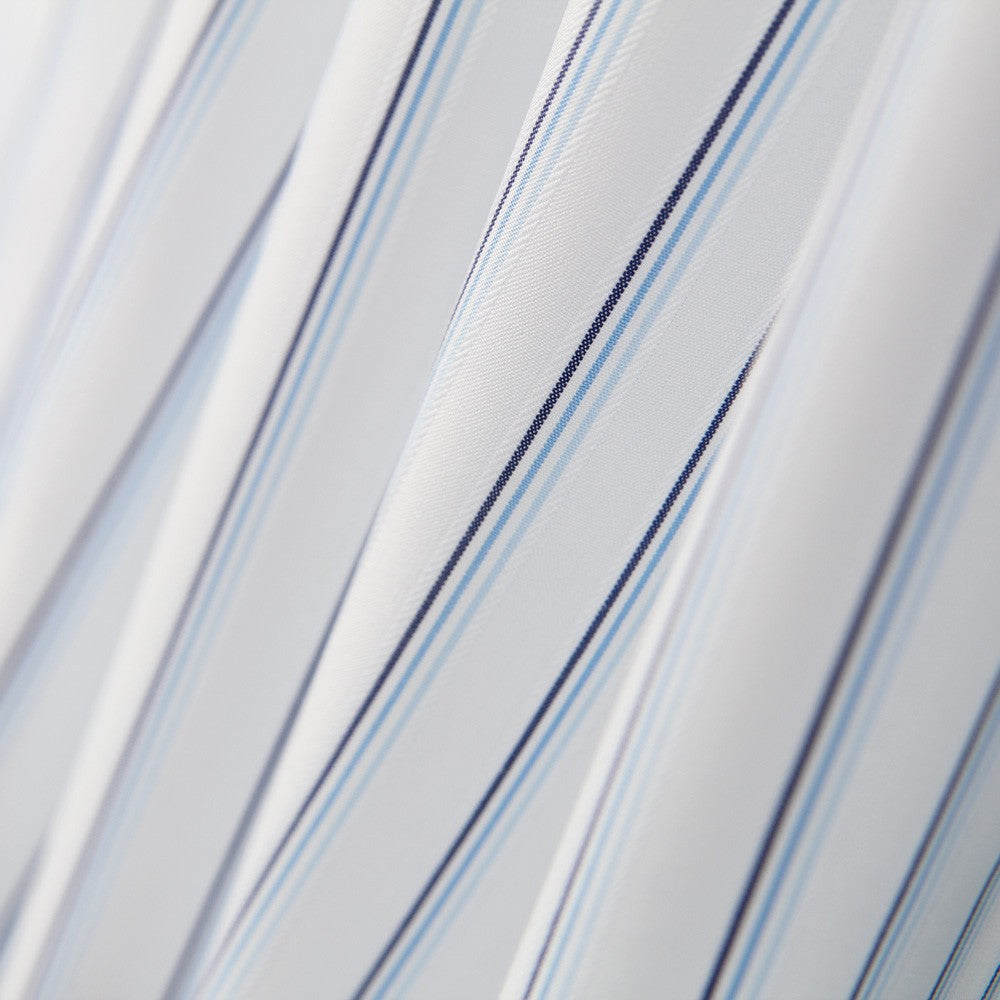 Tecido italiano para camisa com riscas azul claro e marinho. Tecido de algodão para camisas com tiras finas e fluidas de alta qualidade.