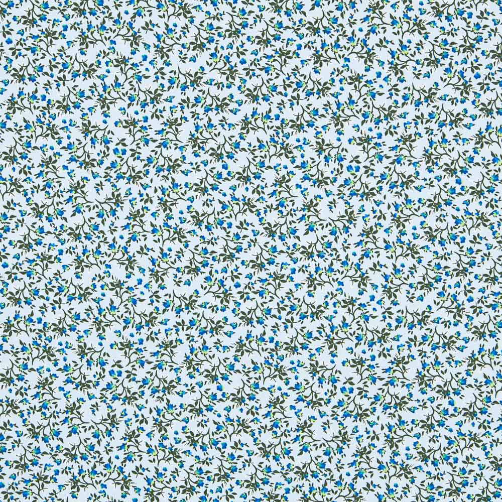 Tecido de algodão com flores azuis para fazer de camisas a máscaras. Tecido de algodão respirável, fino e muito macio, caracterizado pela sua grande versatilidade. A popeline é um tecido básico ideal para fazer almofadas, lençóis, patchwork e todos os tipos de decorações. Uma vez que é um tecido 100% algodão, é preferível pré-lavagem antes de manusear.