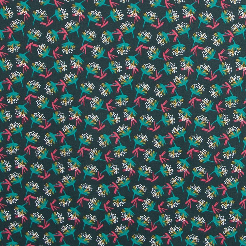 Tecido de algodão bouquet verde escuro. A popelina de algodão é um tecido forte, fino, muito macio e muito versátil. A popelina é um tecido básico ideal para fazer almofadas, lençóis, patchwork e todo o tipo de decorações. Tecidos certificados OEKO-TEX.